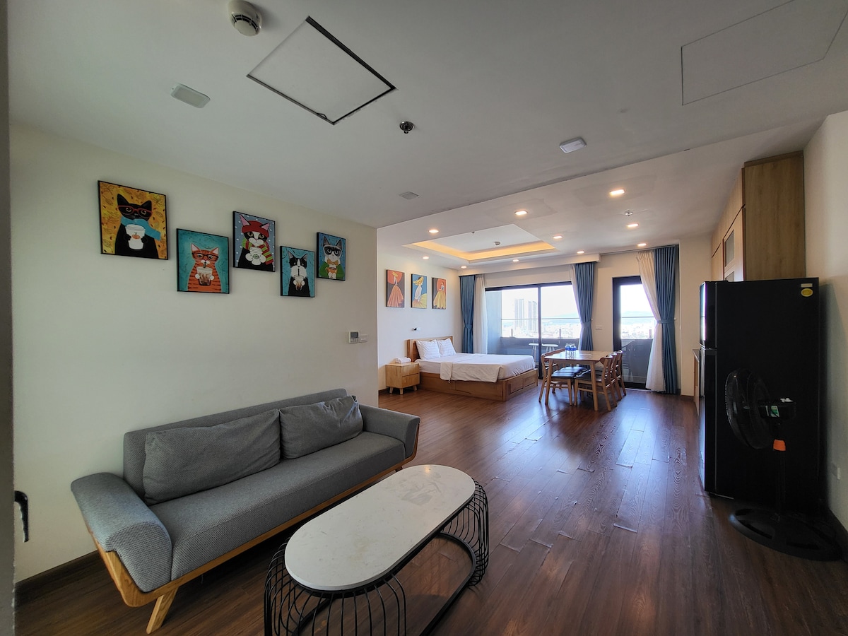 The entire Modern Studio at FLC Sea Tower Quy Nhon - high floor, city center --- with full facilities in modern style, right in front of the beach just 3 minutes walk. This building has the best location in Quy Nhon. It only takes a few minutes to walk to the central beach of the city. There are many delicious and cheap local restaurants around the building within walking distance!!! Balcony with beautiful sea and city view ~
