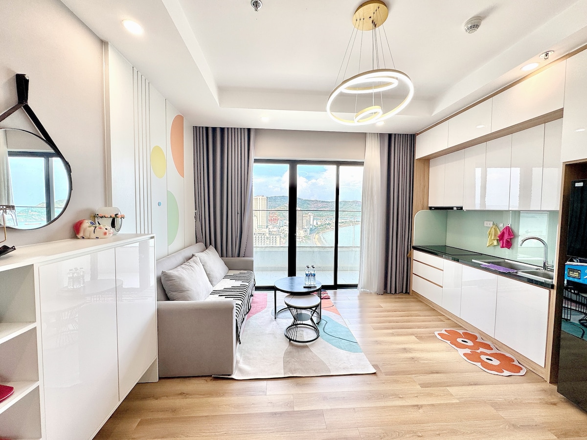 Sea-View Studio with luxurious interior and great view on the 26th floor at TMS Quy Nhon: - Area: 47 m2 - Fluffy and soft mattress with 4-star hotel standard bedding - Smart TV with high speed Internet (upload/download: 150Mbps) - Fully equipped kitchen, fridge, microwave - Rooftop access - Pay per use amenities: pool, gym & spa - Free drinking water - On the beach - Centrally located Suitable for couples that like to cook and enjoy larger spaces.