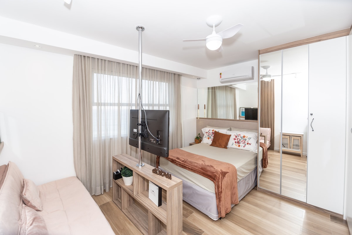 Loft recém reformado, com decoração clean, fechadura digital, quarto e sala integrados com cozinha americana e totalmente equipada. Moderno e seguro, esta acomodação fica em um condomínio com portaria 24h e câmeras de segurança, em uma das melhores localizações de Copacabana (posto 5), ao lado do Museu da Imagem e do Som, com vista para o mar, cercado de uma grande variedade de serviços, como bares, restaurantes, lavanderias, mercados, bancos.