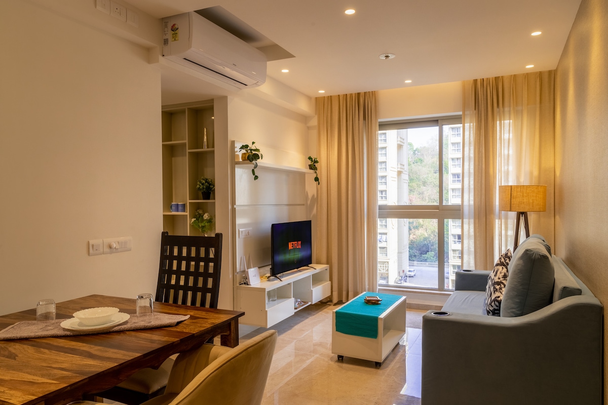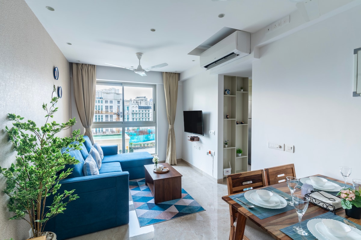 Experience the perfect blend of luxury and comfort in this beautifully spacious 2-bedroom apartment. Ideal for business travellers & visitors to BKC, the apartment offers a serene atmosphere with beautiful tree-lined views from every window – your tranquil retreat in the city that never sleeps. Centrally located, this contemporary haven promises a relaxing environment while you explore Mumbai. The apartment is: - 8 minutes to the Domestic & International airport
