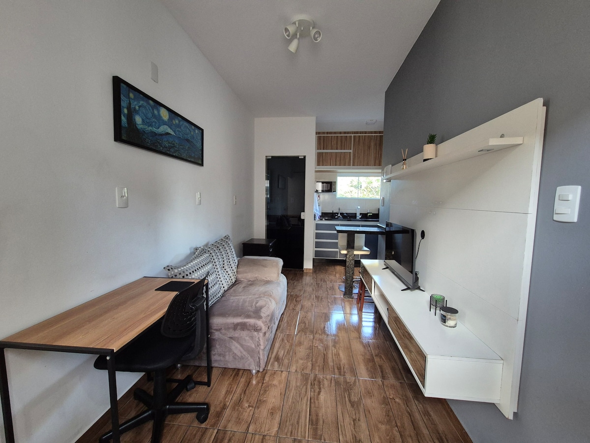 Aconchego e praticidade em um só lugar! Perfeito para uma pessoa, casal e até Famílias pequenas (até 3 pessoas). Nossa acomodação oferece um quarto com ar condicionado, TV com Netflix e Gb play, cozinha equipada e Wi-Fi. Estamos localizados próximos ao Shopping Itaguaçu (850m), Centro Multiuso de São José (2,7km), Hard Rock Café (14,8km) e Centro de Convenções de Florianópolis (7,8km), além de mercados, farmácias e restaurantes. Também é Ideal para explorar as praias incríveis de Norte a Sul.