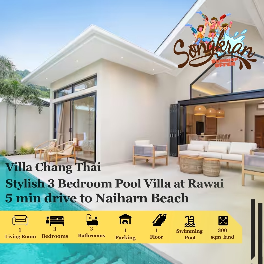 Only 7 minutes walk to beautiful Surin Beach. 4 bedroom Designer villa (280 m2 interior). 3 bedrooms inside the main villa building and the 4th one attached with an access from the garden, pool view. 33 x 8 meter common swimming pool in a large oriental garden. Living room and fully equipped kitchen. Modern Asian style with decorations. Included is breakfast and two way airport transfers.