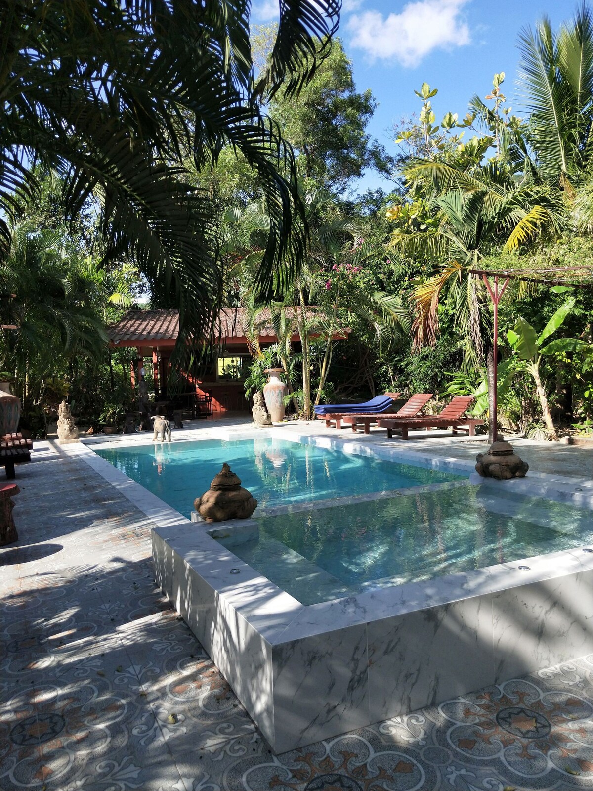 Petit Bungalow situé dans un jardin tropical avec piscine, jacuzzi. Quartier calme proche de toutes les commodités à 500 mètres. Correctement équipé (air conditionné, eau chaude, TV câblée, wifi, coffre fort, micro ondes, bouilloire, cafetière, toaster, ventilateur, petite terrasse). Parking gratuit pour scooter seulement.