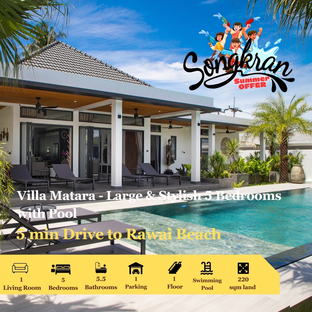 Nestled in prestigious Soi Nam Jai, Rawai, this opulent 5-bedroom luxury villa in Rawai, Phuket offers the perfect private pool villa escape. Each bedroom features an en-suite bathroom, with an open-plan living area and fully equipped gourmet kitchen. Surrounded by landscaped gardens, the villa is just 5 minutes from Rawai Beach and 10 minutes from Nai Harn Beach, ideal for a Phuket holiday villa rental. ✨We provide not just a stay, but an unforgettable Phuket experiences ✨