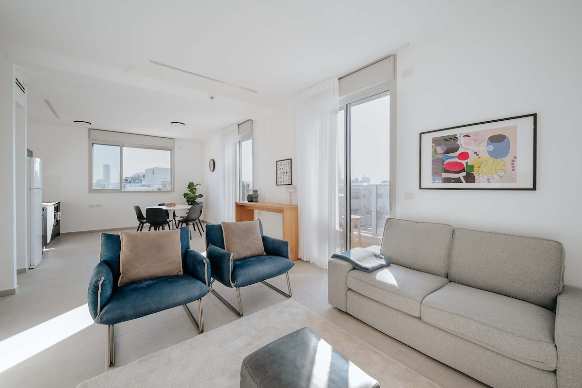 Spacious, Modern & upgraded 2BR apartment in the center of the centre of the city. The bedrooms are very pleasant and the living room is spacious & furnished with a wall-to-wall lounge-like seating system, 65" smart TV. The balcony has a comfortable seating area as well as bar and bar stools, viewing Dizengoff centre and Charnehovski st. it is a very unique view of the city. The kitchen has all the amenities needed to cook inside and make what ever meal you like :)