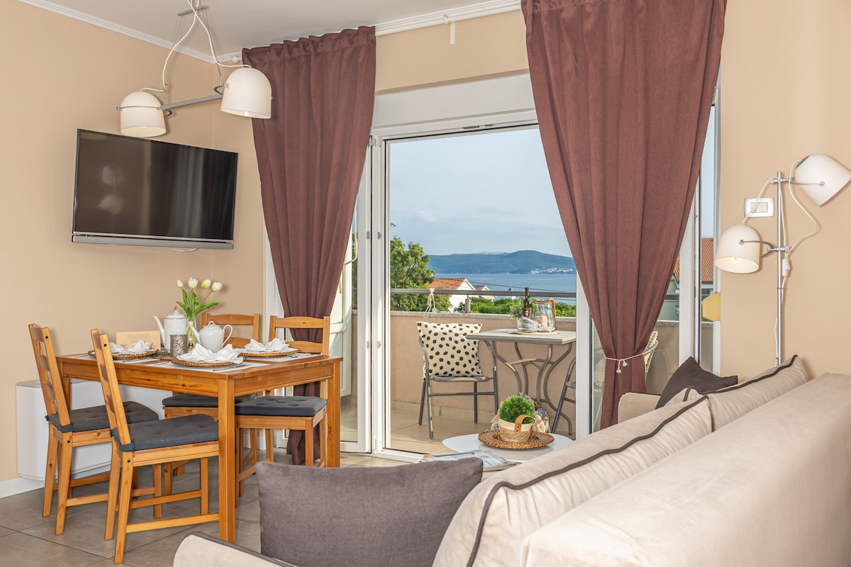 The apartment is located on the first floor of the house. It features a big living room, kitchen and bedroom that has acces to the terrace which features a stunning view of the sea and the island Krk. The apartment is fully renovated and furnished with high quality furniture. We also offer a fresh healthy breakfast made with care and quality ingredients delivered straight to your apartment every morning (12 euro per breakfast).