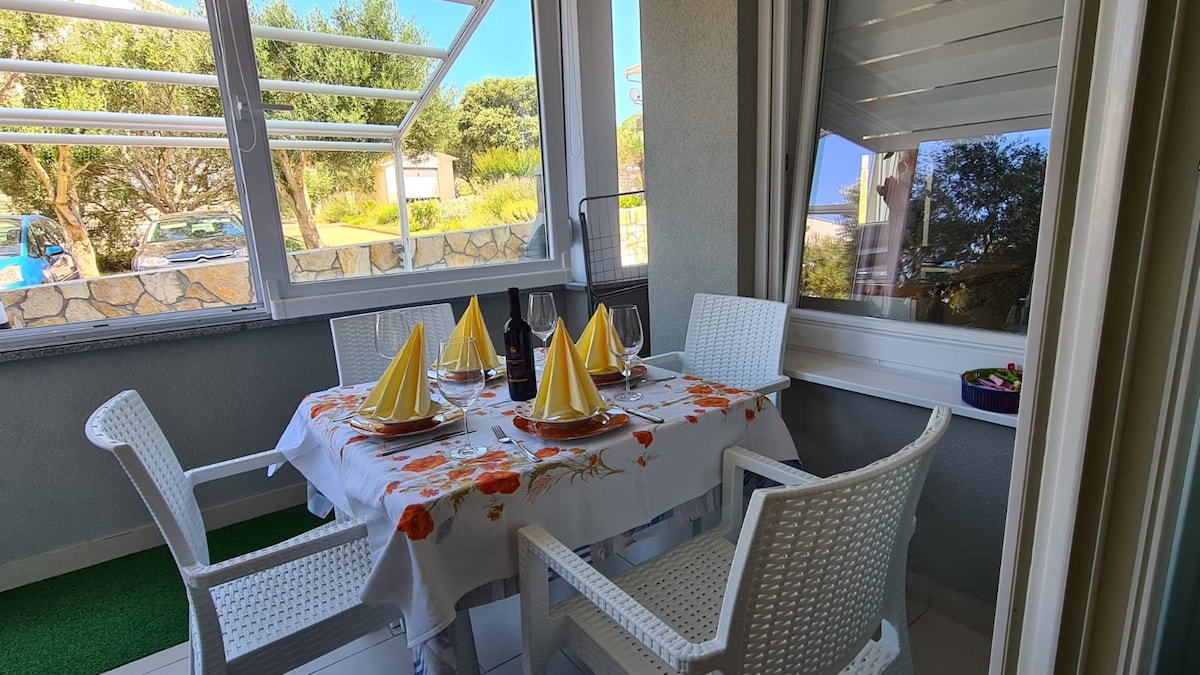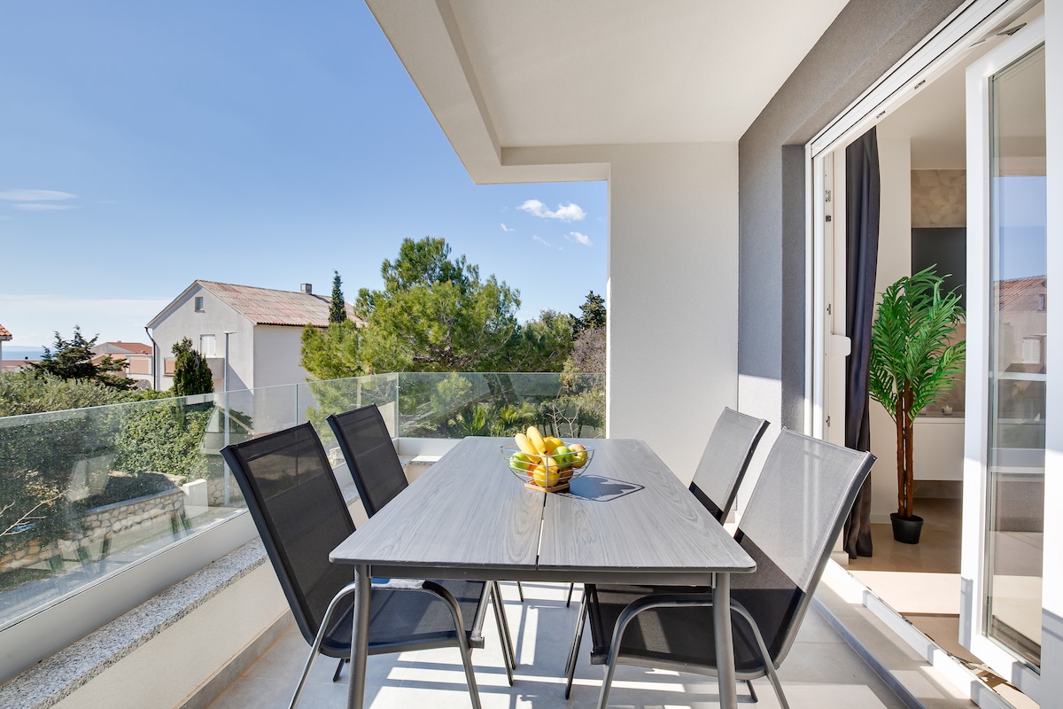 Lovely new completely renovated apartment (year 2022.) with the amazing view over the sea. House is located outside of town in a quiet neighborhood, between pines and plants. Enjoy your meals on the patio prepared using traditional stone barbecue with a natural pine shade. Public stone beach is right in front of the house, so you can enjoy clean sea at any time of the day or night. Experience occasional famous wind Bura which has proven respiratory benefits.
