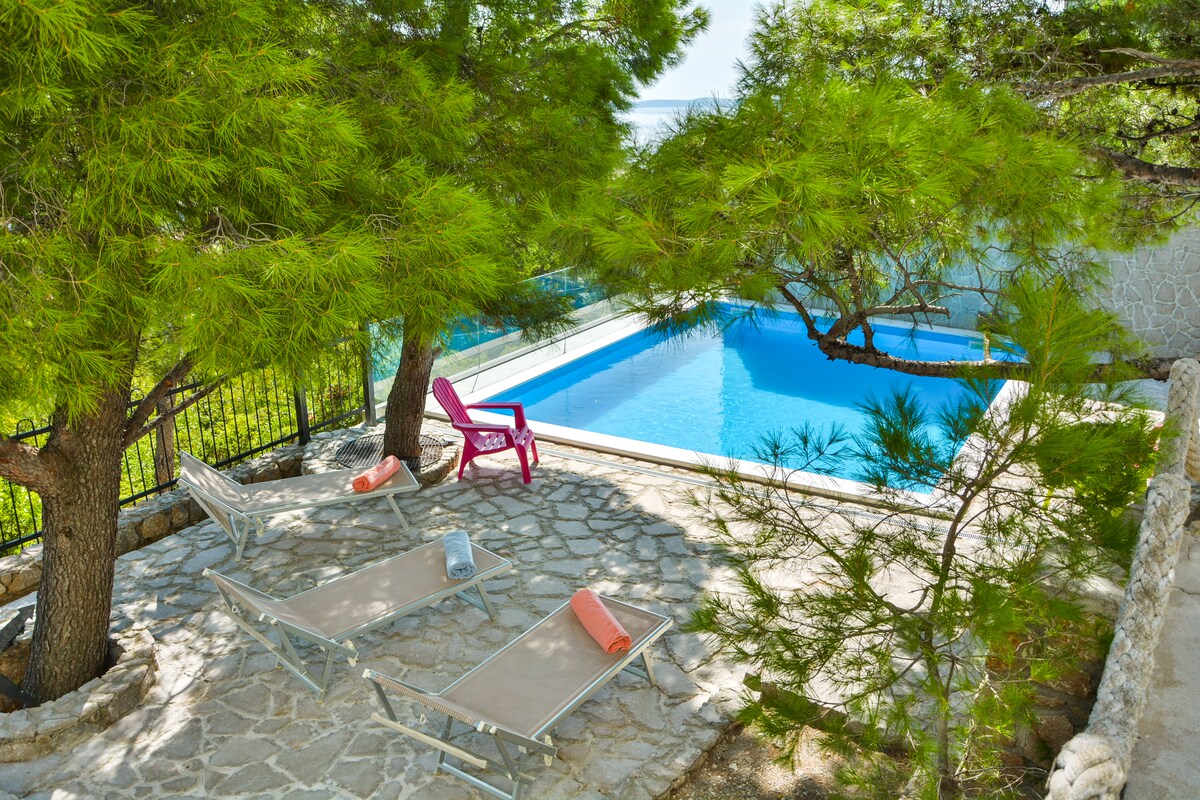 This villa surrounded by greenery and offers a breathtaking view of the Adriatic Sea. The 50 m² pool is filled with salt water. On the ground floor has a fully equipped kitchen, living room and two bedrooms with bathrooms. The living room leads to a beautiful terrace. There is also a summer kitchen and a barbecue area. A bedroom with bathroom, a sauna and a dressing room are on the first floor. It also has a gallery with exercise machines and table football. The villa offers two garage spaces.
