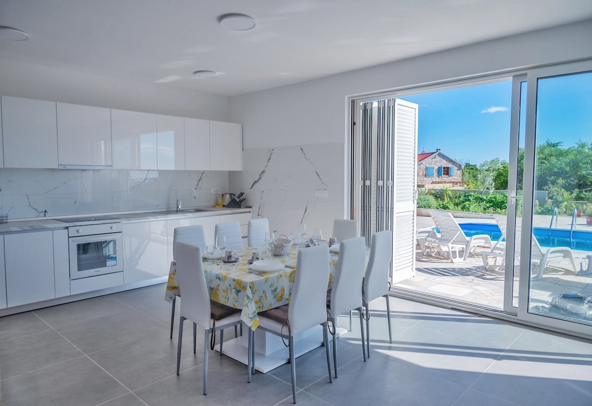 Novoizgrađena kamena villa sa bazenom, 500 metara od plaže, grill,parking za tri automobila, u mirnom okruženju! Villa ima 5 zvjezdica, veličine 200 m2 i uključuje pet spavaći soba, četiri kupaonice, WC i teretanu.U selu se nalazi dvije trgovine a blizina prekrasne plaže je na 7 minuta hoda. Plaža posjeduje plavu zastavu i kristalno čisto more.Domaćin govori engleski.