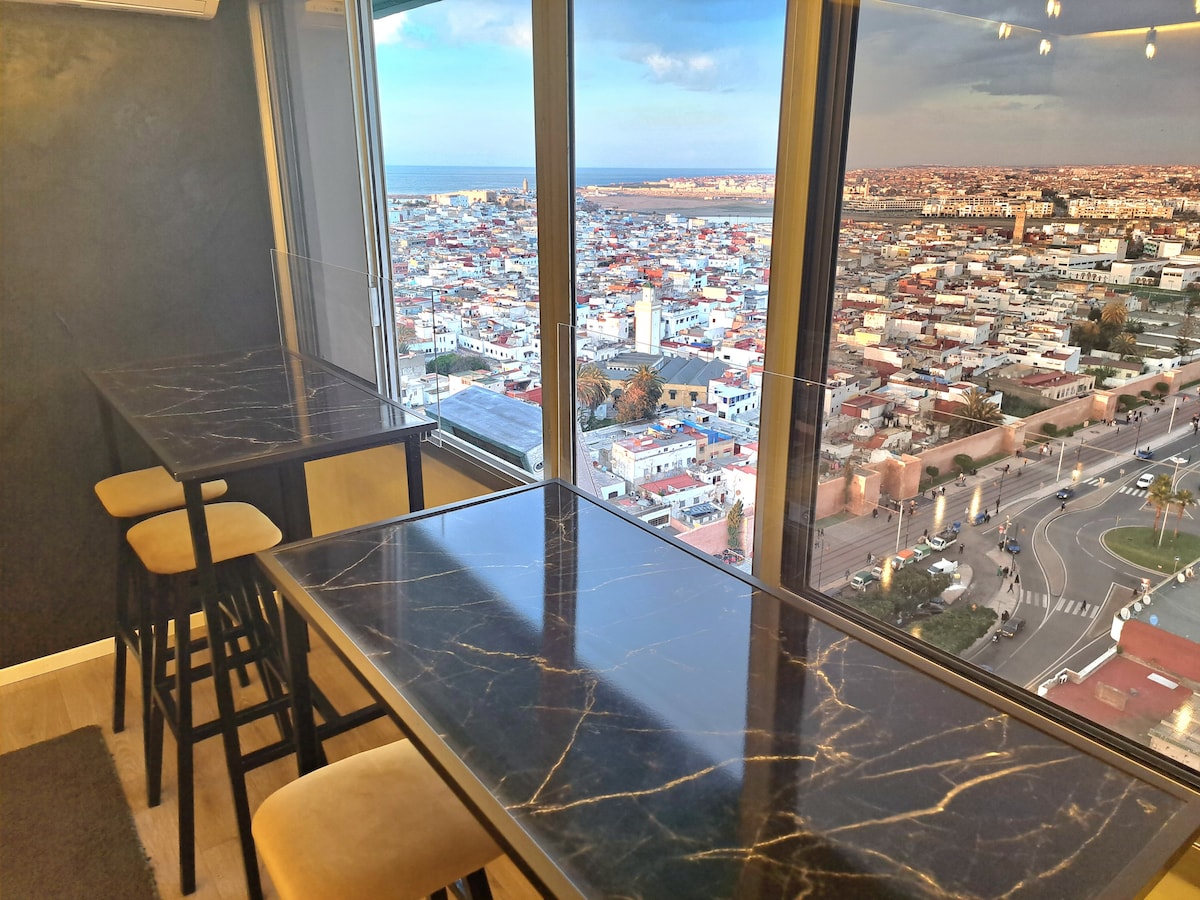 Luxe, Confort et Vue . - Appartement entièrement rénové au sommet d une tour ,unique, idéalement placé au centre ville de rabat, proche de tous les sites et commodités, ce qui facilite la planification de votre visite. - Vue panoramique à couper le souffle digne d'un tableau de maître , étendue sur l ancienne Medina , l Atlantique , la rivière Abou Regreg, La kasbah des Oudayas et plusieurs monuments emblématique. - L'ensemble de l Appartement a une vue fascinante de jour comme de nuit.