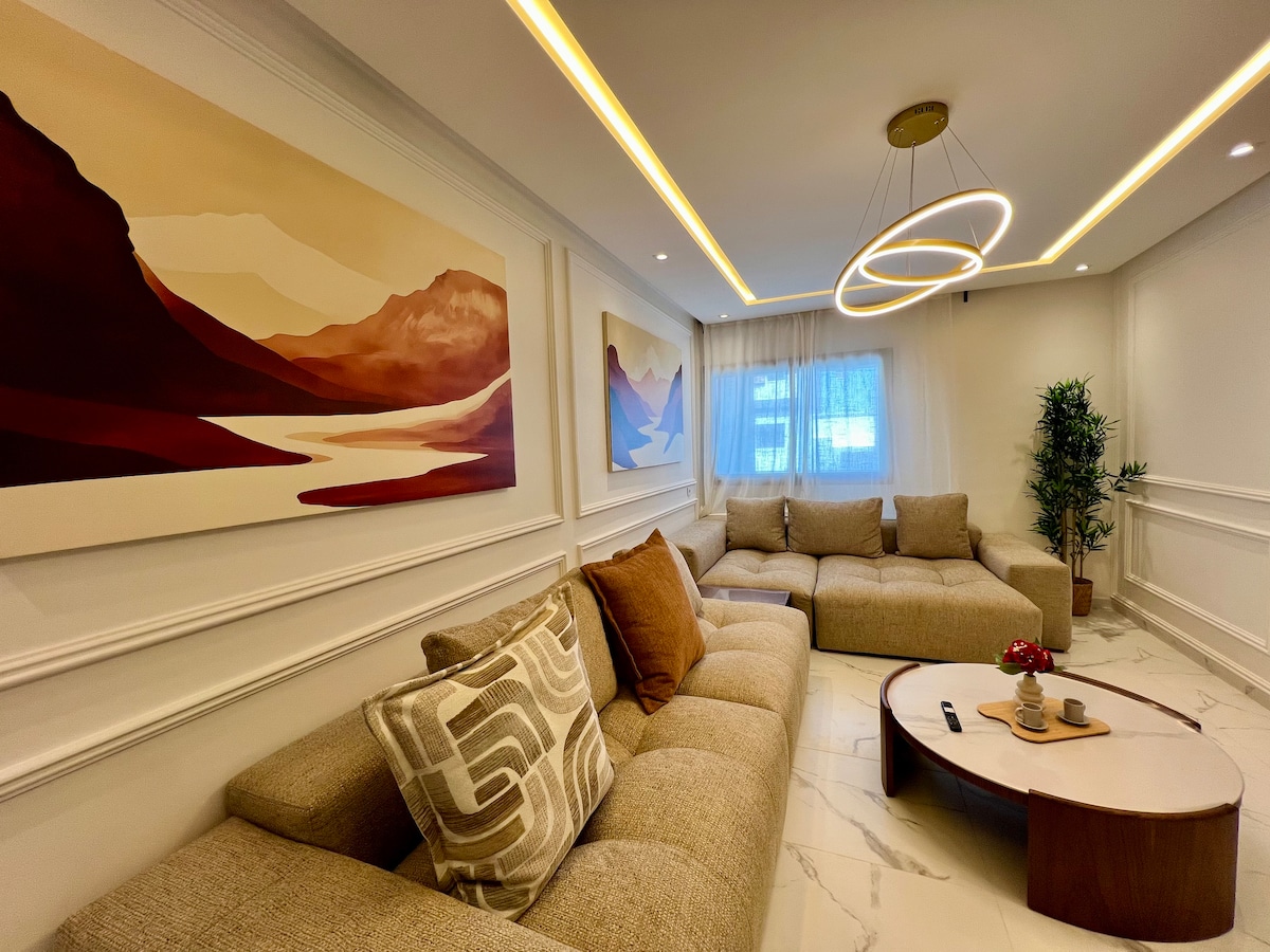 Explorez l'exclusivité à 5 min de la plage dans cet appartement lumineux de 100 m². 2 chambres, un vaste salon et une cuisine équipée, il marie confort et sophistication. Niché dans un quartier vibrant, entouré de restaurants alléchants, il propose une immersion totale. tramway à quelques pas, taxis disponibles instantanément, et une place au garage, Laissez-vous emporter par l'élégance de ce refuge, où chaque détail concourt à faire de votre séjour une expérience mémorable.