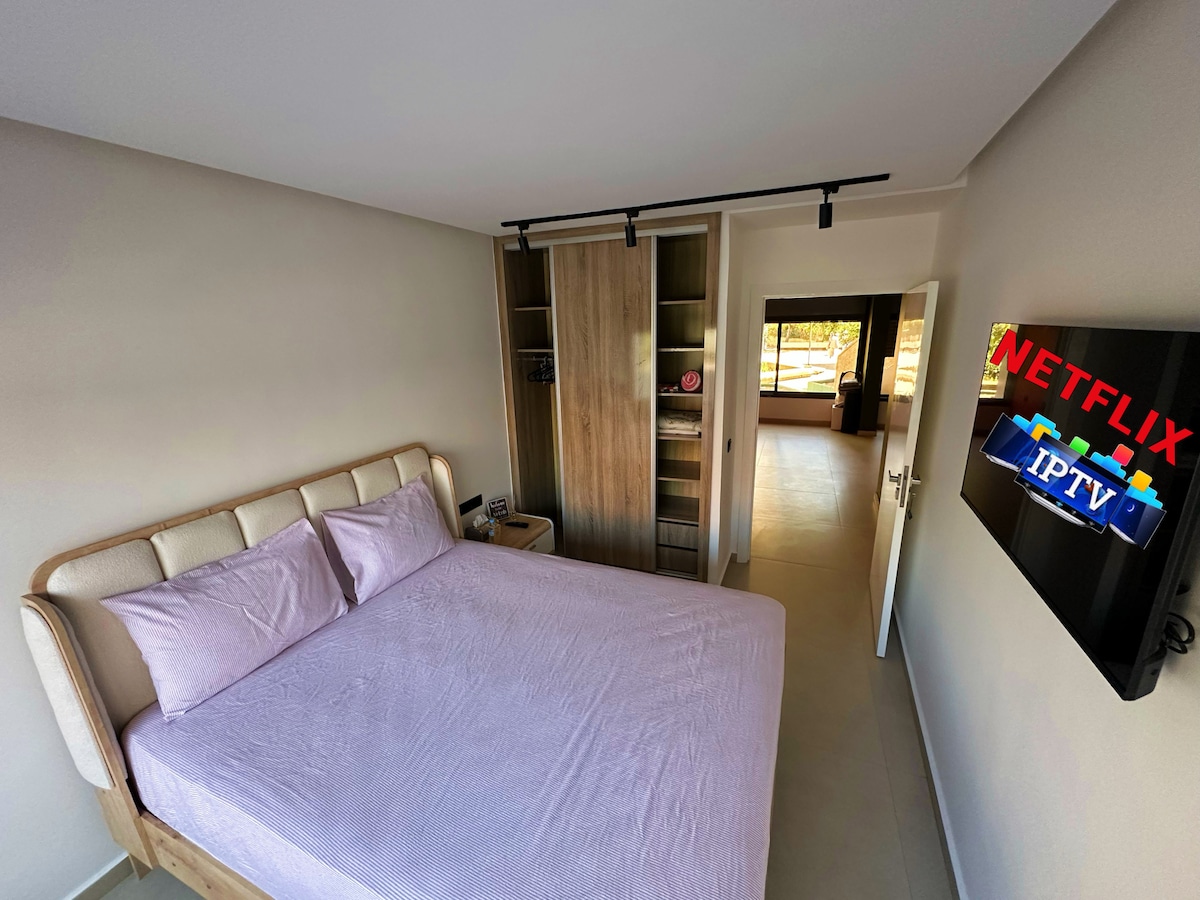 Experience luxury in this prestigious apartment situated within a newly constructed building. Nestled in the tranquil upper area of the lively Agdal neighborhood, this spacious apartment is perfect for your capital city stay. It comprises a generous bedroom with an ensuite bathroom, a welcoming living area with an additional guest bathroom, outdoor space, and a highly functional kitchen. Furthermore, you'll find all the essential amenities for a nice stay, wifi, dishwasher, washing machine etc