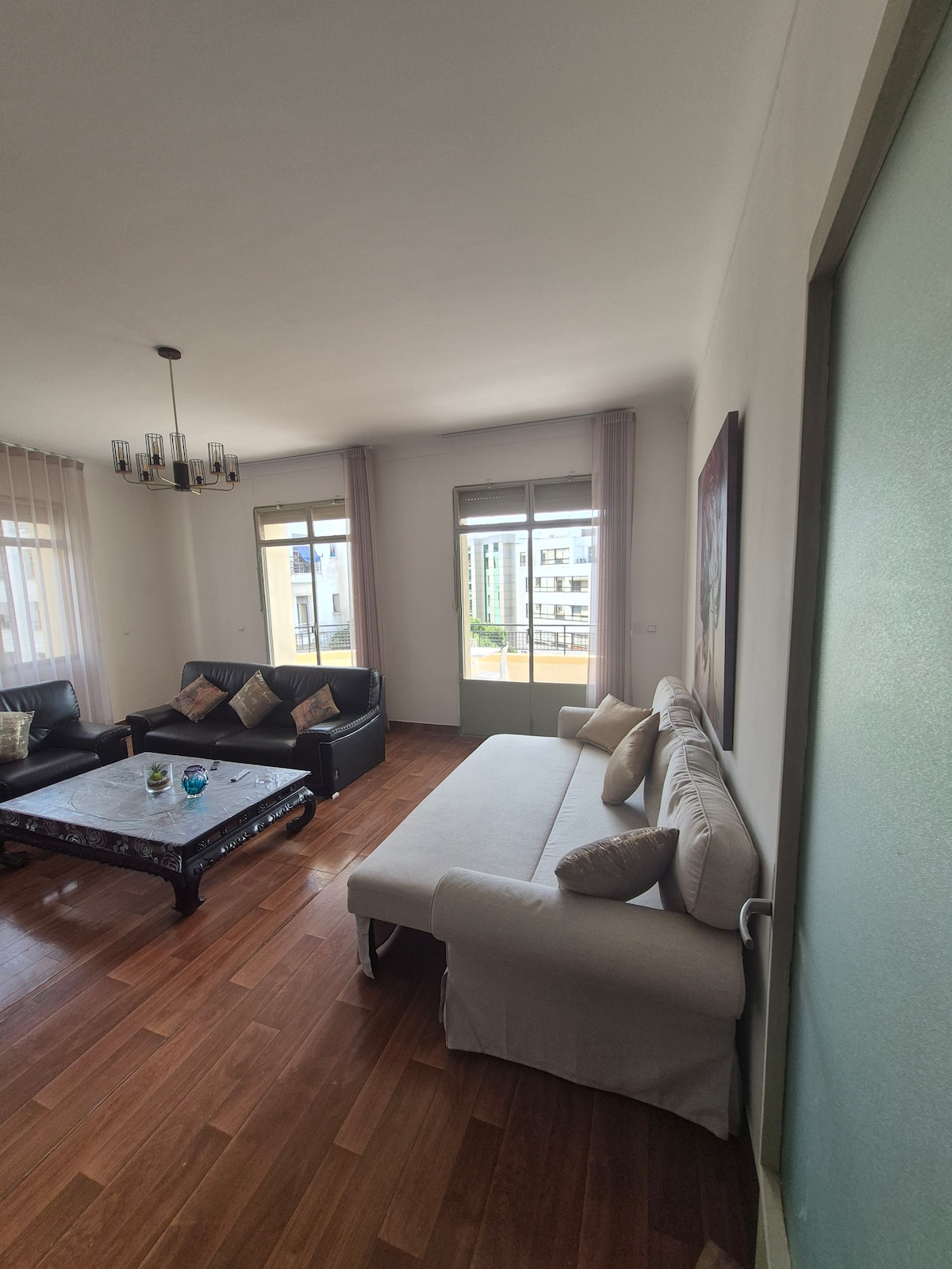 Large luxurious apartment (220m²). On Agdal's main avenue 100meters from train station Instaworthy & eventready 55m² living room 1st floor, elevator, sunny. Fireplace.Two balconies Renovated on 07/19: fully equipped kitchen, AC, TVs, Internet, coffee, washing machine ... 100 meters away from Agdal high speed train station, Starbucks & various quality restaurants, bars & pubs nearby Private garden & underground parking Ultra secure neighborhood. Residence guarded 24/7 Taxi points & Tramway nearby