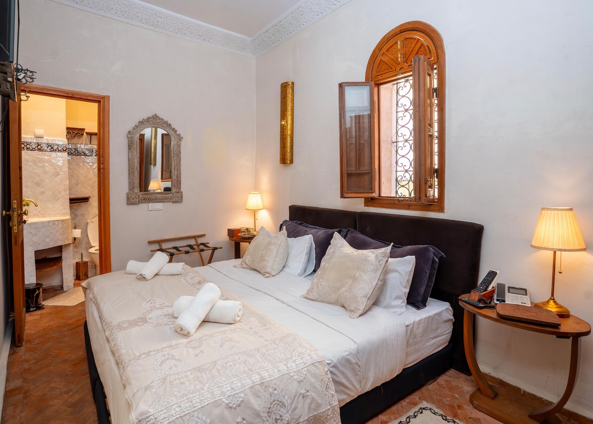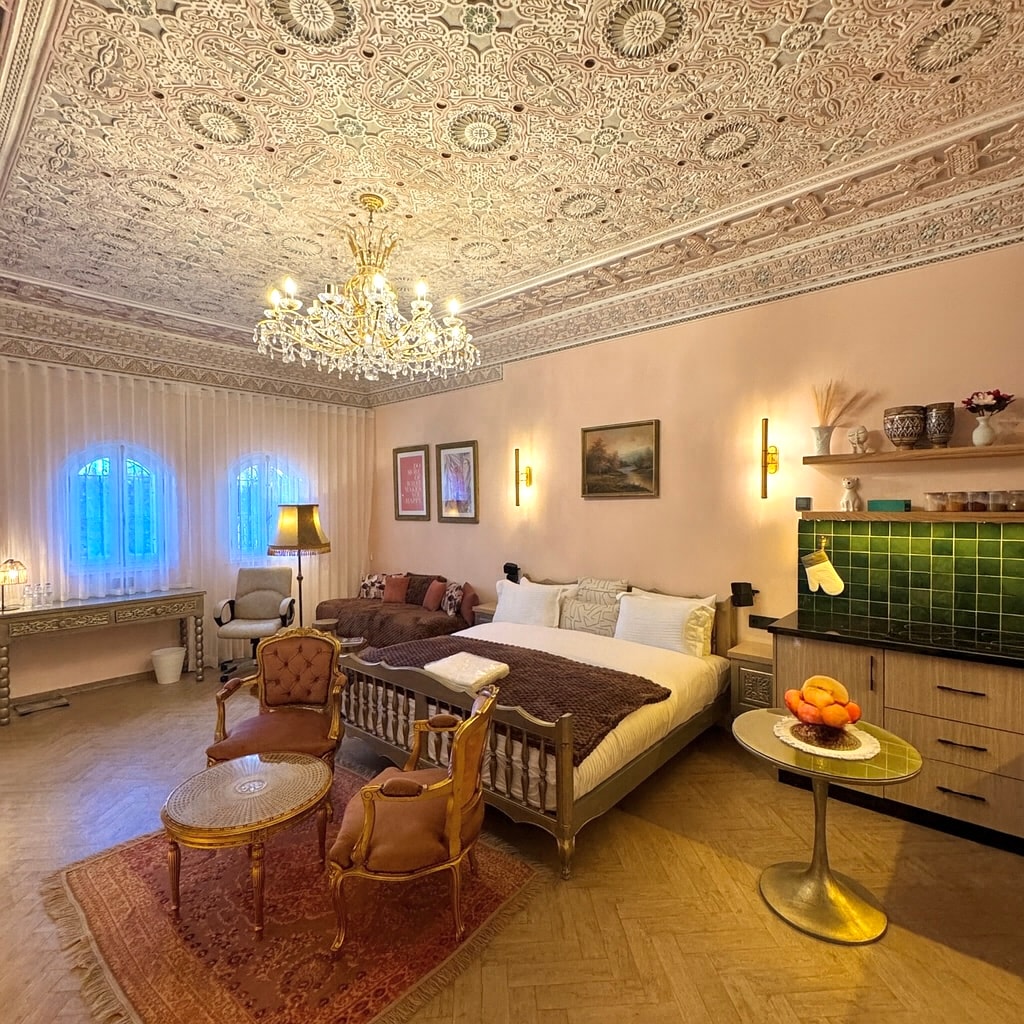 Chambre avec salle de bain dans un petit Riad arabo andalou calme dans l'ancienne médina de Rabat à deux pas du centre ville et des lieux touristiques de la capitale du Maroc. Accès à la terrasse panoramique, au patio et salon TV et connexion wifi gratuite. Petit déjeuner possible. Le petit déjeuner 8 euros /P/nuit (frais et fait maison) n'est pas inclus dans le prix de la chambre. Breakfast down at home is not included in the room price, the price is an additional price for 8 euros/person.