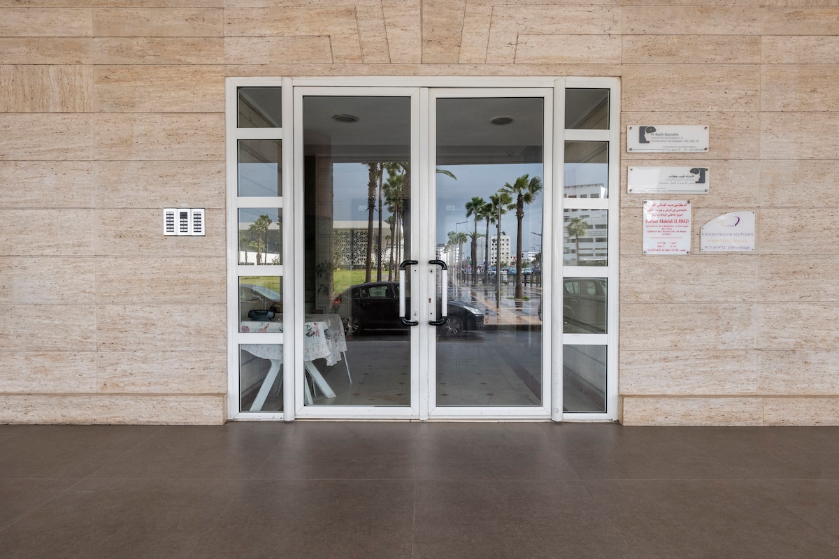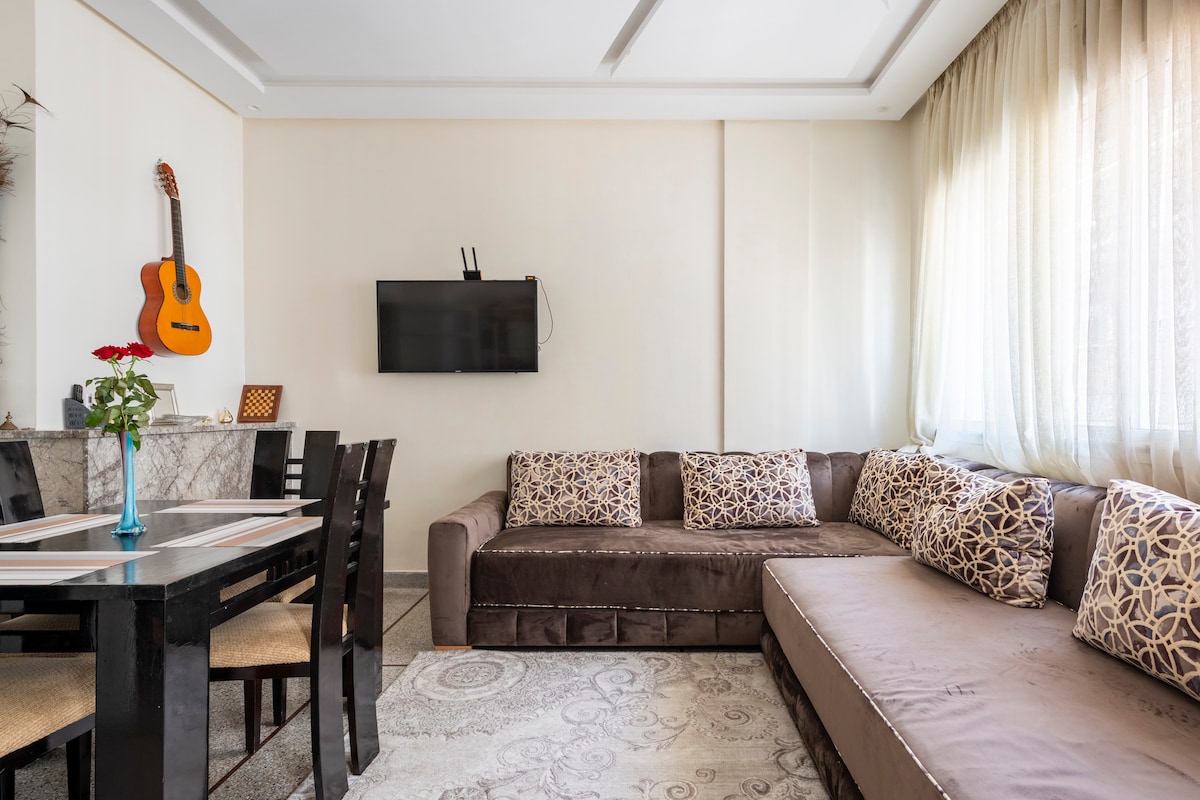 Un charmant appartement,Situé au rez-de-chaussée, pratique pour ma personne âgée. vue sur jardin, idéalement situé dans un endroit calme, à seulement 15 minutes de la ferme des loisirs, la plage, les jardins exotiques, Magic Parc, la gare ferroviaire et la tour Mohammed VI. À proximité de marina et l'aéroport de Salé. Avec son goût raffiné, propreté optimale et équipement complet, cet endroit offre un cadre confortable pour votre séjour, vous permettant de profiter de votre temps de détente.