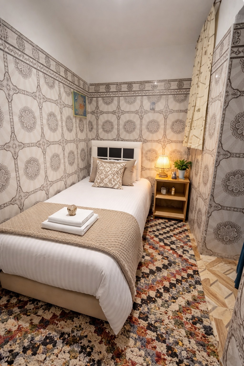 À la Belle Muraille est un élégant appartement de 82 m², baigné de lumière, situé dans une superbe bâtisse coloniale pleine de caractère. Entièrement meublé et décoré avec soin dans un style marocco-contemporain raffiné, il offre un cadre confortable et apaisant. Idéalement situé au cœur du quartier Hassan, à deux pas de la gare Rabat-Ville, du tramway, de Bab El Had, de la médina, des musées, restaurants, cinémas, c’est l’adresse idéale pour vivre une expérience authentique.