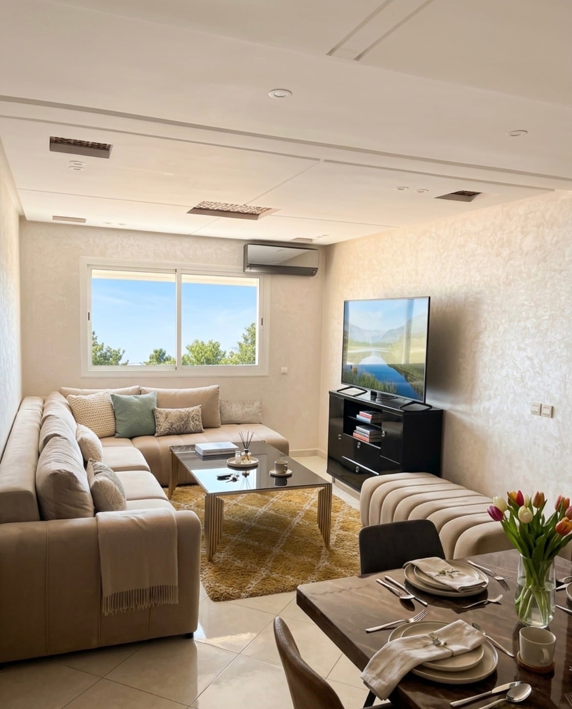 Welcome to your modern 2BR retreat in Salé—minutes from Rabat. Walk to train, tram and shops, with quick access to Rabat & the airport. Warm, light-filled interiors create a true home-away-from-home. Enjoy two cozy bedrooms, a bright lounge with 43” Smart TV, Netflix and fiber WiFi, plus a fully equipped kitchen. AC on request. Self check-in via smart lock in a calm, secure residence—ideal for couples, families or friends. Thoughtful touches for a stress-free stay—extra comfort and privacy.