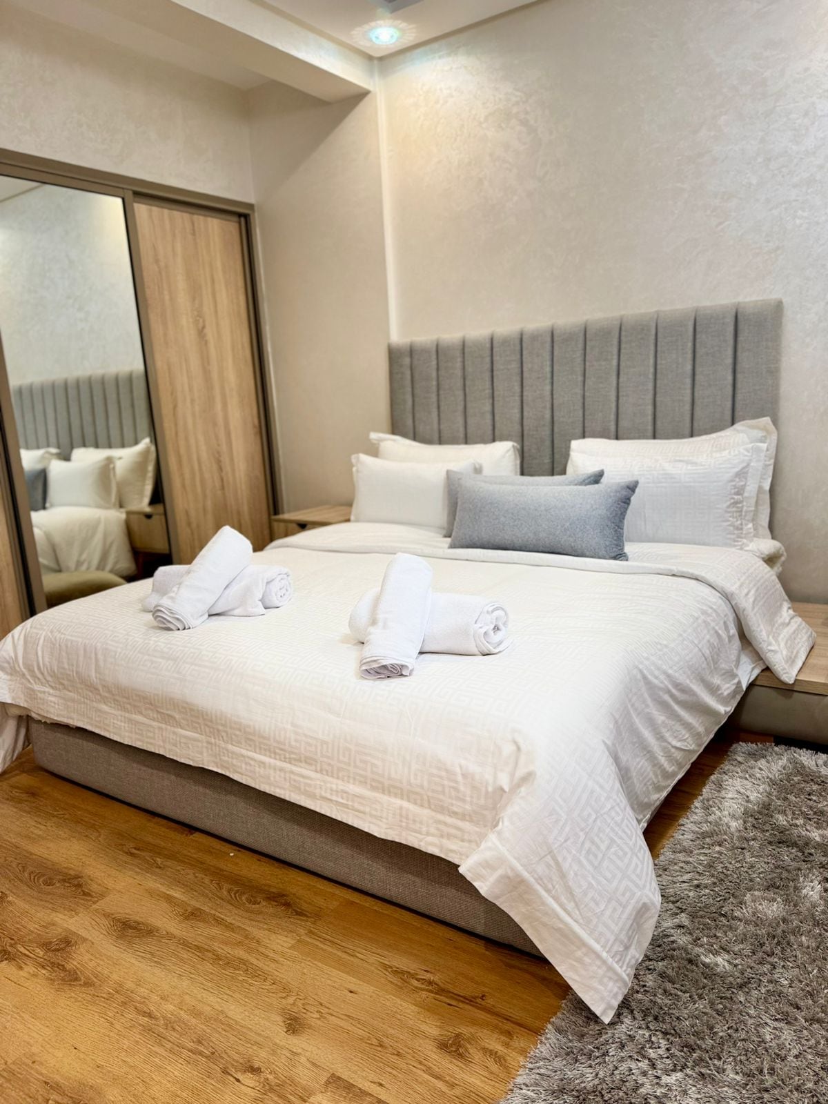 Élégant 90 m² 1BR Flat – 5 min à pied du stade Moulay Abdellah pour la CAN 2025. Spacieux et confortable, idéal pour les supporters, couples ou voyageurs d’affaires. ✅ Self check-in 24h/24 ✅ Terrasses dans tout le logement ✅ Résidence sécurisée+parking ✅ Wifi/Netflix/IPTV ✅ Cuisine équipée, 2 salles de bain 🔆 Vue panoramique depuis la suite parentale Emplacement stratégique : à seulement 5 minutes à pied du stade Prince Moulay Abdellah, parfait pour ne rien manquer des matchs de la CAN 2025