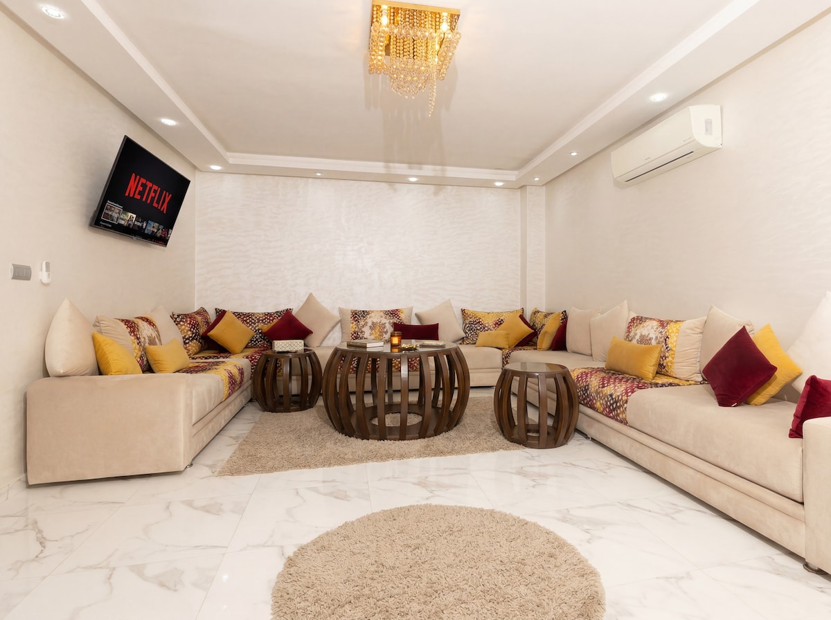 Profitez en famille de ce fabuleux logement complètement neuf ( mobilier et immobilier) qui offre de bons moments en perspective, situé à cinq minutes de la plage de Mehdia et dans un quartier très calme entre villas. Maison entièrement équipée de toutes les commodités nécessaires (cuisine équipée, télé, wifi,clim...). Ce logement est entouré de cafés, marchés, salle de sports... Ce logement est spécialement pour les familles, il vous fera sentir comme chez vous.