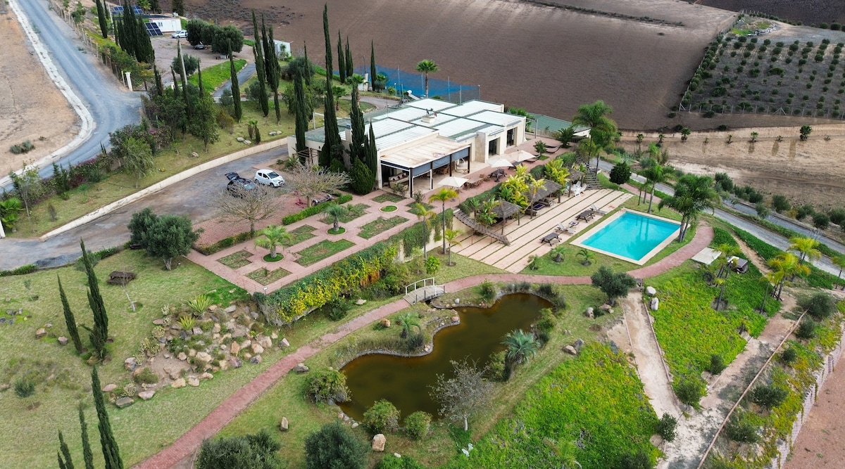 Une ferme somptueuse sur 5 ha, située à Sidi Allal Bahraoui à seulement 40 minutes de Rabat. Le gîte jouit d’une vue exceptionnelle sur la campagne. Espace 100% privé avec beaucoup de charme pour les amoureux de la nature. Le parking est gratuit et la piscine est privée et sans vis à vis. Les installations sont modernes et élégantes. Vous pouvez effectuer des balades équestres sur place. Ce relais champêtre vous comblera par son charme et son confort. Dépaysement garanti !