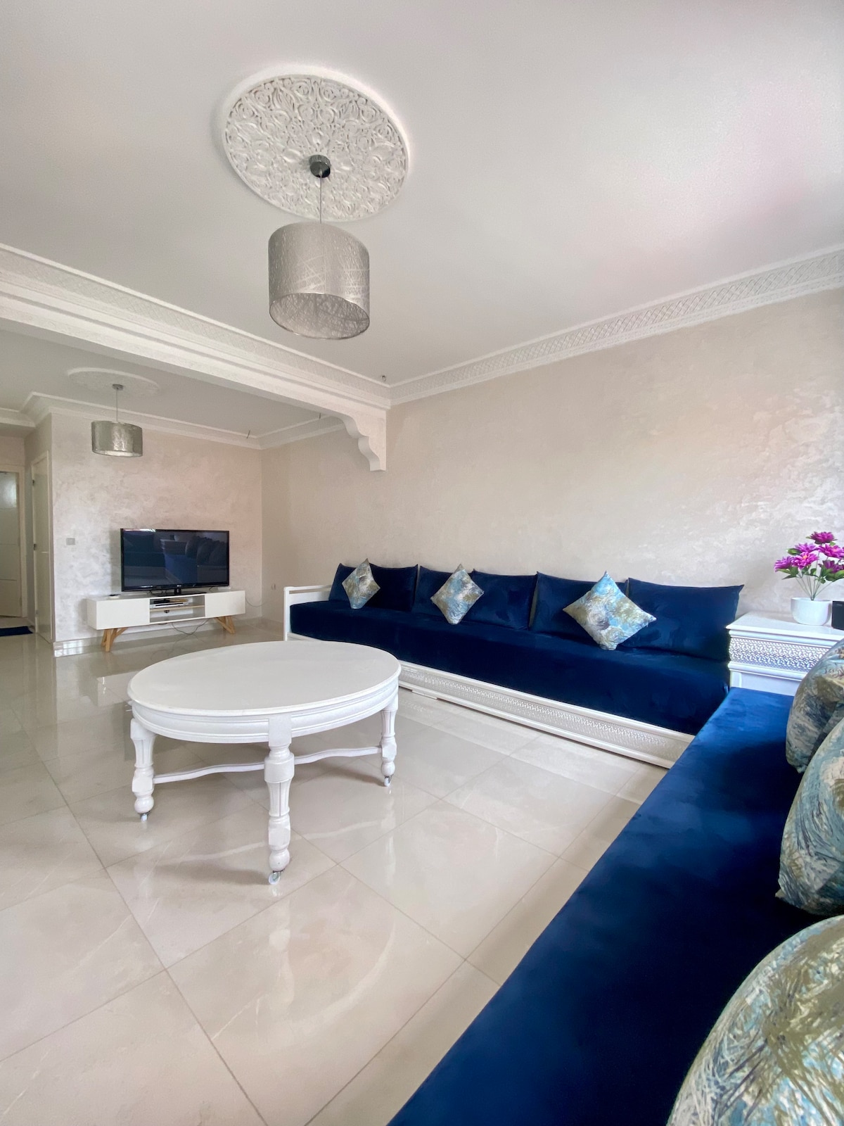 Appartement de 102 m² meublé, situé à Prestigia, Hay Riad, Rabat, doté d'une belle vue sur le stade de foot/forêt/océan. Composé de 2 chambres, 2 Salles de bain, cuisine équipée, salon, terrasse. Ideal pour un voyage d'affaires ou séjour familial. Situé dans une résidence sécurisée avec piscine, plus place de parking réservée. Quartier actif et chic, proches de tous commerces et commodités (supermarché, pressing, banque, cafés, restaurants...), ainsi que des ministères et administrations.