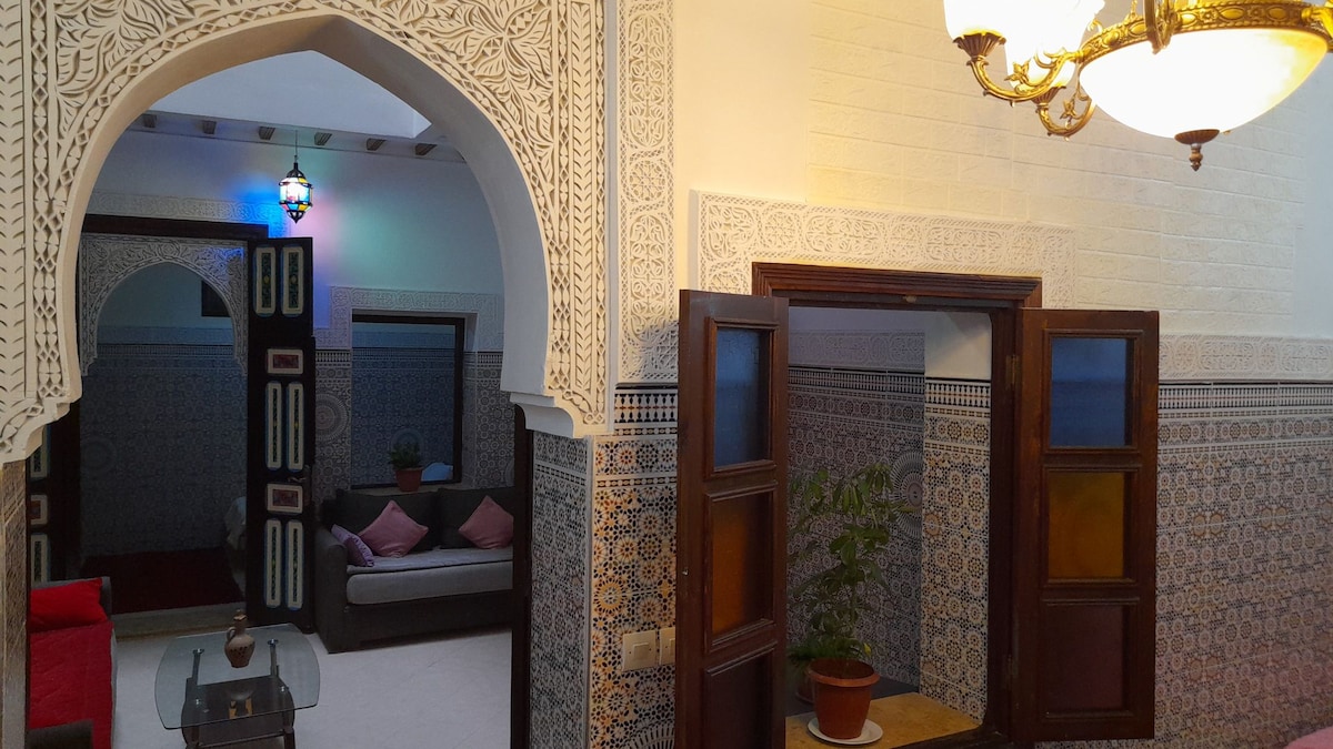 un Riad traditionnel situé dans la médina de salé ( immerssion dans la vie locale ) très calme , parking gardé à proximité,wifi TV avec chaines europeennes gratuits) , à quelques pas de la marina et plage de salé , des restaurants , de RABAT. cuisine équipée, lave linge, lave vaisselle , TV , vaisselle et draps serviettes fournis , LIT bébé. terrasse équipée avec petite vue sur océan , à proximité de la station de tramway .