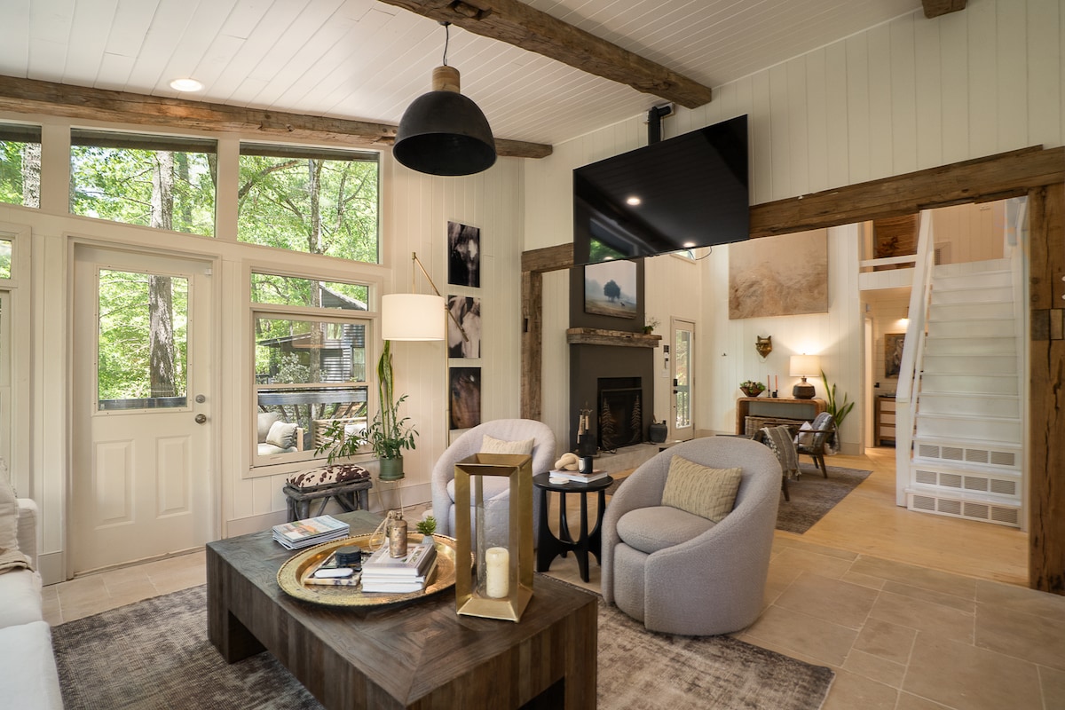 Secluded, yet mins to downtown! Tucked away on a private wooded lot with mountain views from every window, Sassy Cabin is a stylish retreat designed for relaxing and recharging. With a spacious hot tub under the stars, magical outdoor lighting, and minimalist interiors that let nature shine, this tranquil escape is just minutes from downtown Clayton -yet feels a world away. Easy to access with all paved roads. Perfect for couples & families. 3 bedrooms, all with private bathroom. Pet friendly.