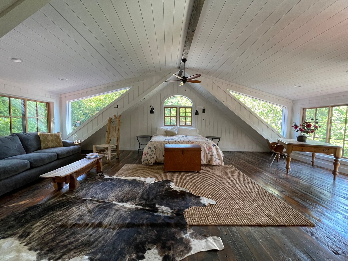 The loft offers privacy, pretty views and lots of yard to roam, yet it is still close to great hiking, waterfalls and parks, incredible restaurants and lots of shopping. You’ll love our place because of the high ceilings, the views, the location, and the wide open space. Our place is good for couples, solo adventurers, business travelers, families (with kids), and furry friends (with fee). We do have two dogs that roam the property. Ralphy is a dachshund and tank is an energetic black lab.