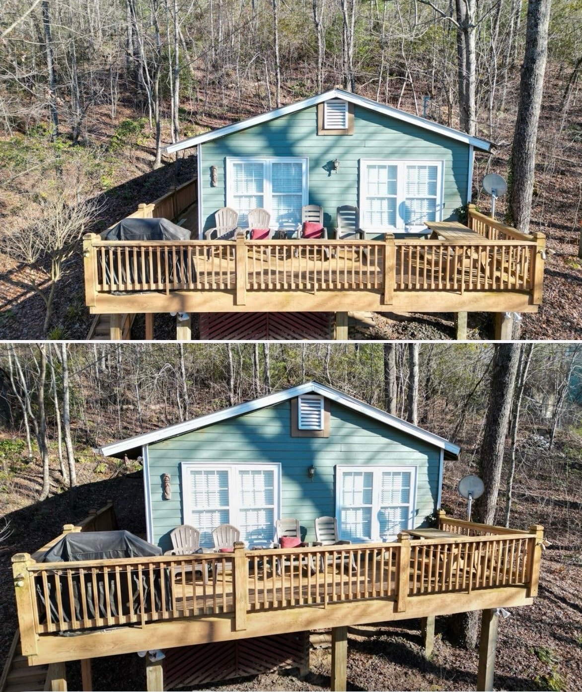 With views for miles, those looking for a view, peace and quiet will not be disappointed. The cabin sits just 3 miles from downtown Clayton, on Screamer Mountain facing South Carolina. With upper and lower wrap around decks, there is plenty of places to sit and enjoy the views. The lower deck is covered, with ceiling fans for enjoying the views. There is a large, flat parking area with easy access to the cabin.