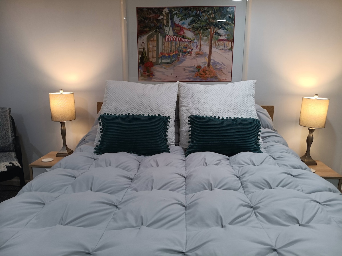 Experience downtown charm at our fully renovated Graduate Apt, a stone's throw from the lake. Enjoy serene views from Main St facing windows. Our apartment features a quiet bedroom with a queen bed and smart TV, and a cozy living room that includes a convertible queen sofa with premium linens. Indulge in a fully equipped kitchen, in-unit laundry, and complimentary Hulu access. Ideal for both business and leisure. Ask about our adjacent Greyhound Suite for larger groups!