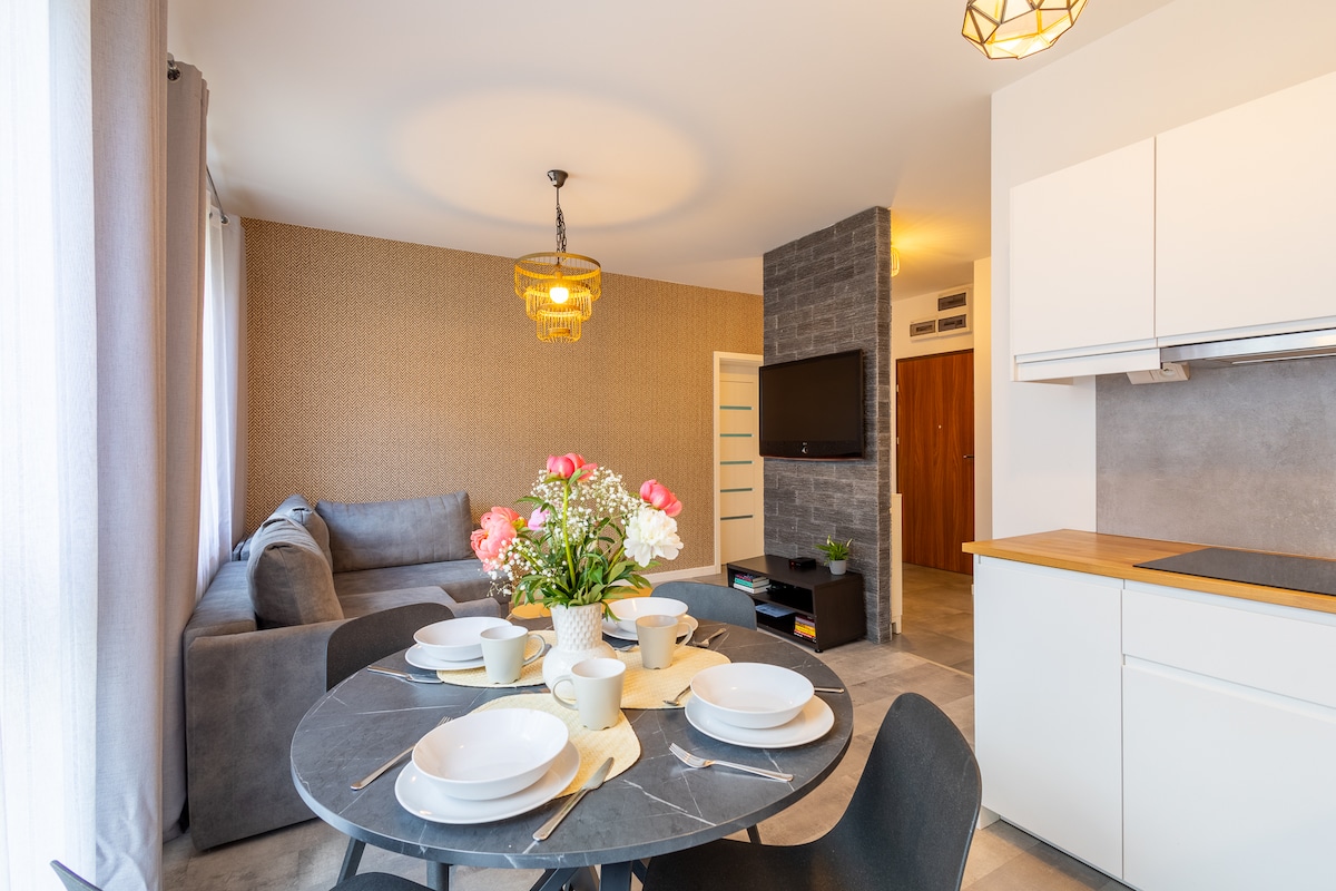 An exclusive, modern and functional apartment with a bedroom, large living room with a beautiful view of Wroclaw. It is located in a new apartment building on the 13th floor with its own underground car park and 24/7 security. The fully equipped kitchen allows you to prepare homemade meals. High standard, comfort, security and a sense of privacy make guests feel at home. Wireless Internet and Netflix. Access to the gym, dry and steam sauna, jacuzzi and children's playroom.