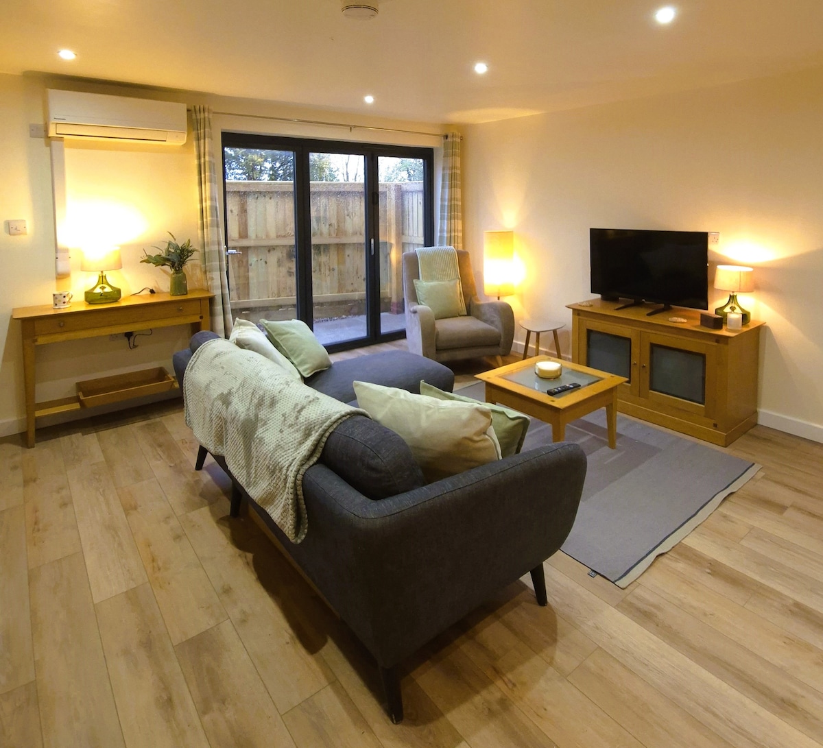 The ground floor of the property consists of lounge/diner with table that sits 5. There’s an L-shaped sofa that converts into a double bed and 42” LCD. Kitchen consists of microwave, kettle, fridge, single plug in induction ring and toaster and all the essentials you need. The ground floor has underfloor heating so it’s cosy warm. Upstairs is a king size bed, large bedroom, fantastic walk-in shower, smaller sofa bed and area to hang your stuff up. There’s even space for your four legged friend.