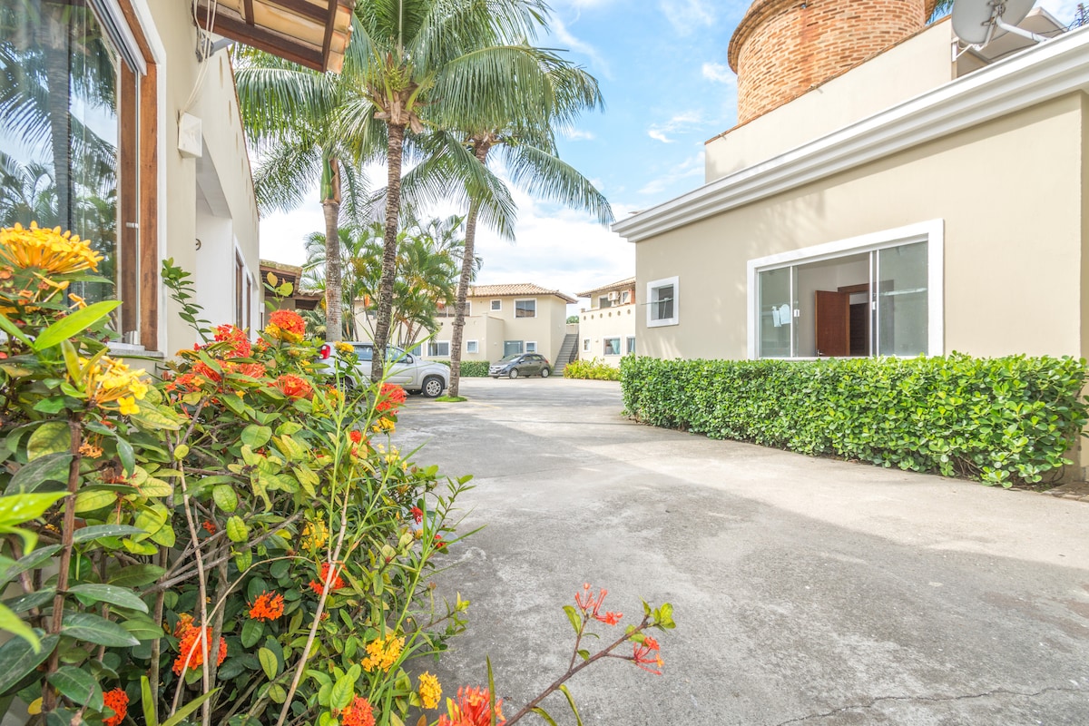 A casa acaba de passar por uma reforma na sala, cozinha e área externa. Ficando ainda mais aconchegante e bonita. Linda, nova, toda mobiliada e com todos os utensílios domésticos. Churrasqueira privativa e chuveirão na varanda . Muito perto e Fácil acesso a diversas praias. Ar Split na sala e nos 2 quartos. 5 min a pé da Rua das Pedras ( Deixe o seu carro na garagem e va a pé ) Condomínio fechado com garagem Porteiro e Segurança 24 horas. Cadeiras de praia e 🏖 Internet Wi-fi Disponível