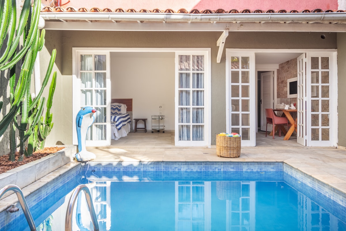 This is a beautiful apartament in Búzios with one independent suite (double bed, air conditioner), room with a sofa/daybed, TV with NetFlix and YouTube and air conditioner, a kitchen with all utensils, and a comoom bath. The location is amazing, it's close from Rua das Pedras, Orla Bardot and beaches.