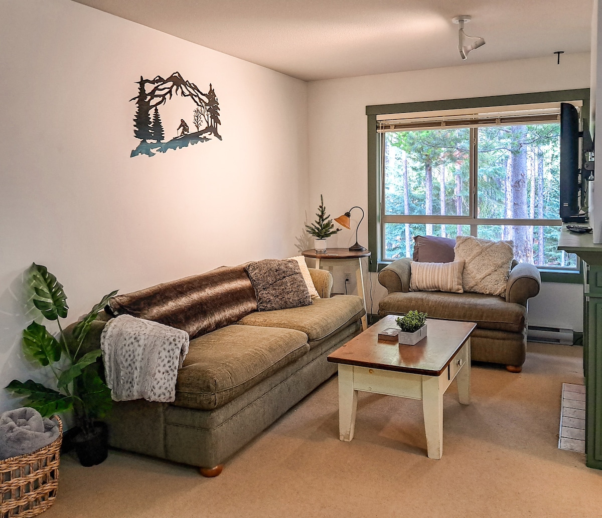 Fall in love with the Rocky Mountains in this creek side ski in ski out townhouse. Fully renovated, this beautiful Riverbend Panorama home, with a view of the mountains, is located steps away from the gondola and hiking trails along the picturesque Toby Creek. There are two separate bedrooms, each with their own full on-suite bathrooms, and a fire side queen size sofa bed (with upgraded foam mattress) in the living room to accomodate a total of six guests.