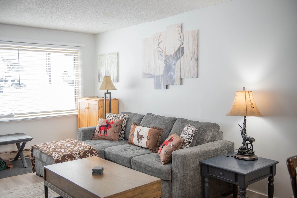 Escape to your home away from home with this condo next to James Chabot beach. It is a 2 min drive to Eagle Ranch Golf Course and downtown, & 15-minute drive to Radium Hot Springs. Open concept kitchen, dining & living area with a 55" flat screen TV. Enjoy your coffee and meals on the private balcony. The master bedroom has a custom queen rustic bed, a walk-thru closet & a full ensuite. The second bedroom has a rustic double bed. Incl. swimming pool (Seasonal), 2 hot tubs, and a fitness centre.