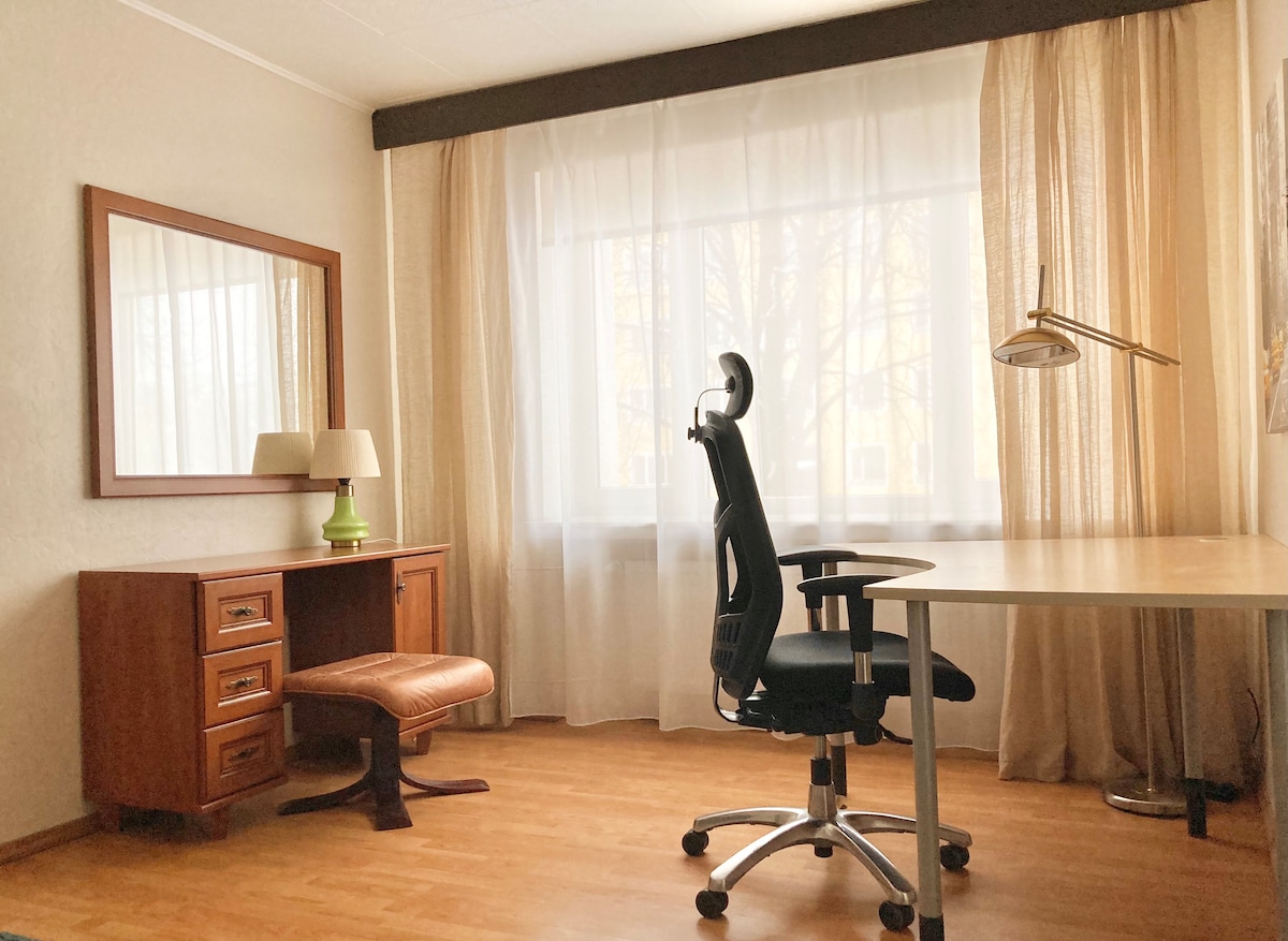 Спокойное жилье недалеко от центра города, 12 минут езды на трамваях 2 и 4 ,остановка которых находится примерно в 100метрах от дома,можно и пешком дойти примерно за 20 минут.Автовокзал и аэропорт в 5 минутах езды,при желании и малом количестве вещей можно дойти пешком.За углом дома находится продуктовый магазин Maxima, работающий без выходных с 8.00-22.00,немного дальше по этой же улице находится круглосуточный магазин «Sikupilli Prisma»,большой парк Kadriorg с музеями ,променадом около моря.