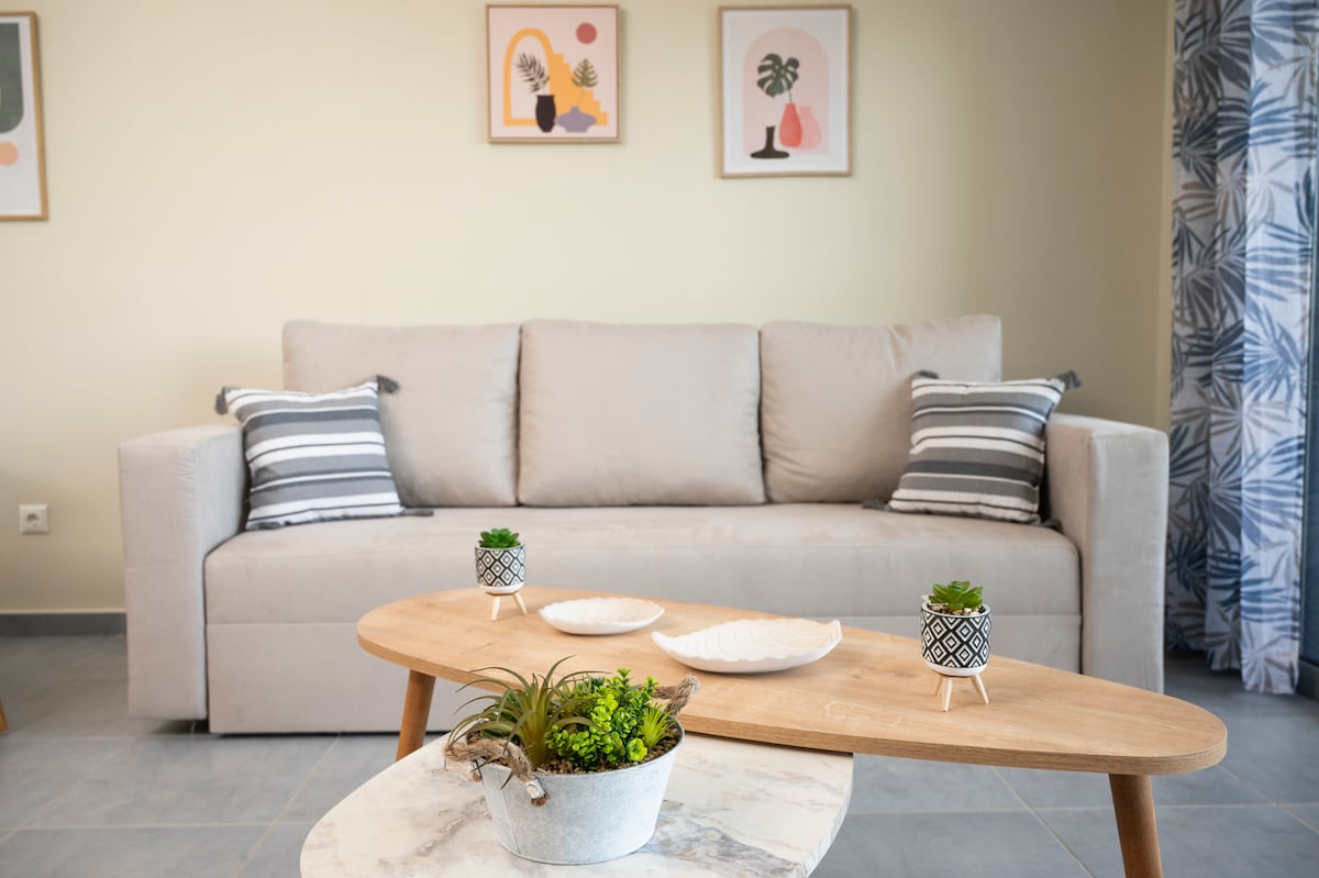 Experience the modern, serene apartment in front the beach , 10 mins from the airport and right in the center of the little sea side town Loutsa. Enjoy this modern spacious 1 bedroom , 1 bathroom apartment with sea views. This home accommodates a total of 4 guests , with a queen size bed in the bedroom and a full pull out bed that turns in to 2 beds in the living room. High end amenities and the serene design of the apartment will make your stay a memorable experience.