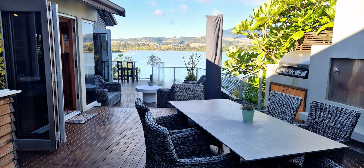 Relax and enjoy the spectacular views of the harbour from the spacious, elevated deck of this well-appointed Raglan beach house. Take in the beautiful views while you enjoy a barbeque on the deck, chill on the loungers, or stretch out on the sofa. Enjoy comfortable, clean beds, quality linen, a well-equipped kitchen, a movie on Netflix, a stereo, a garden to explore or take out a kayak - there are two here for guests to use.