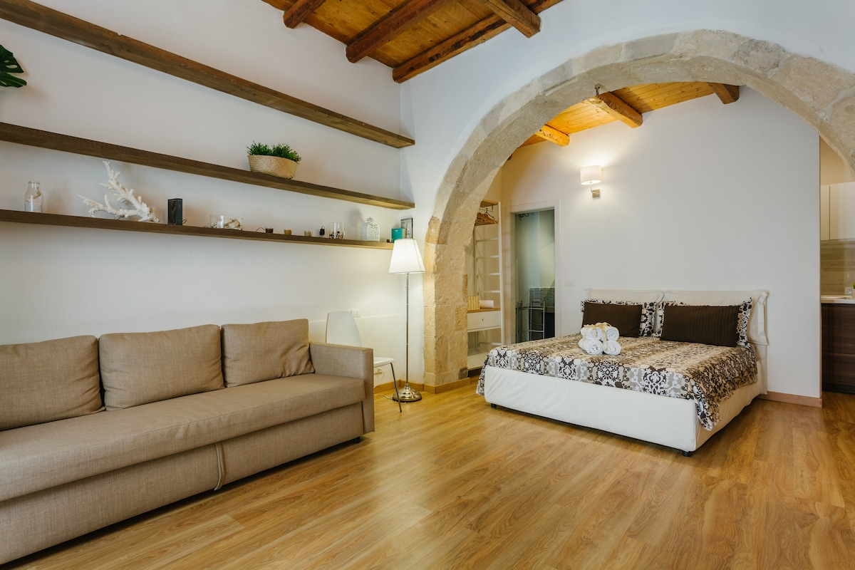 Dionisio 6 is an elegant, cozy and warm ground floor apartment, located in the Jewish neighbourhood of "La Giudecca" in the heart of ORTIGIA, just 50 mt from the sea. Our loft has been completely renovated in 2021 through a careful conservative restoration using the highest quality materials in order to respect the characteristics of the ancient building in which it is located. Functionality and design have been mixed with the antiquity of the architectural structure.