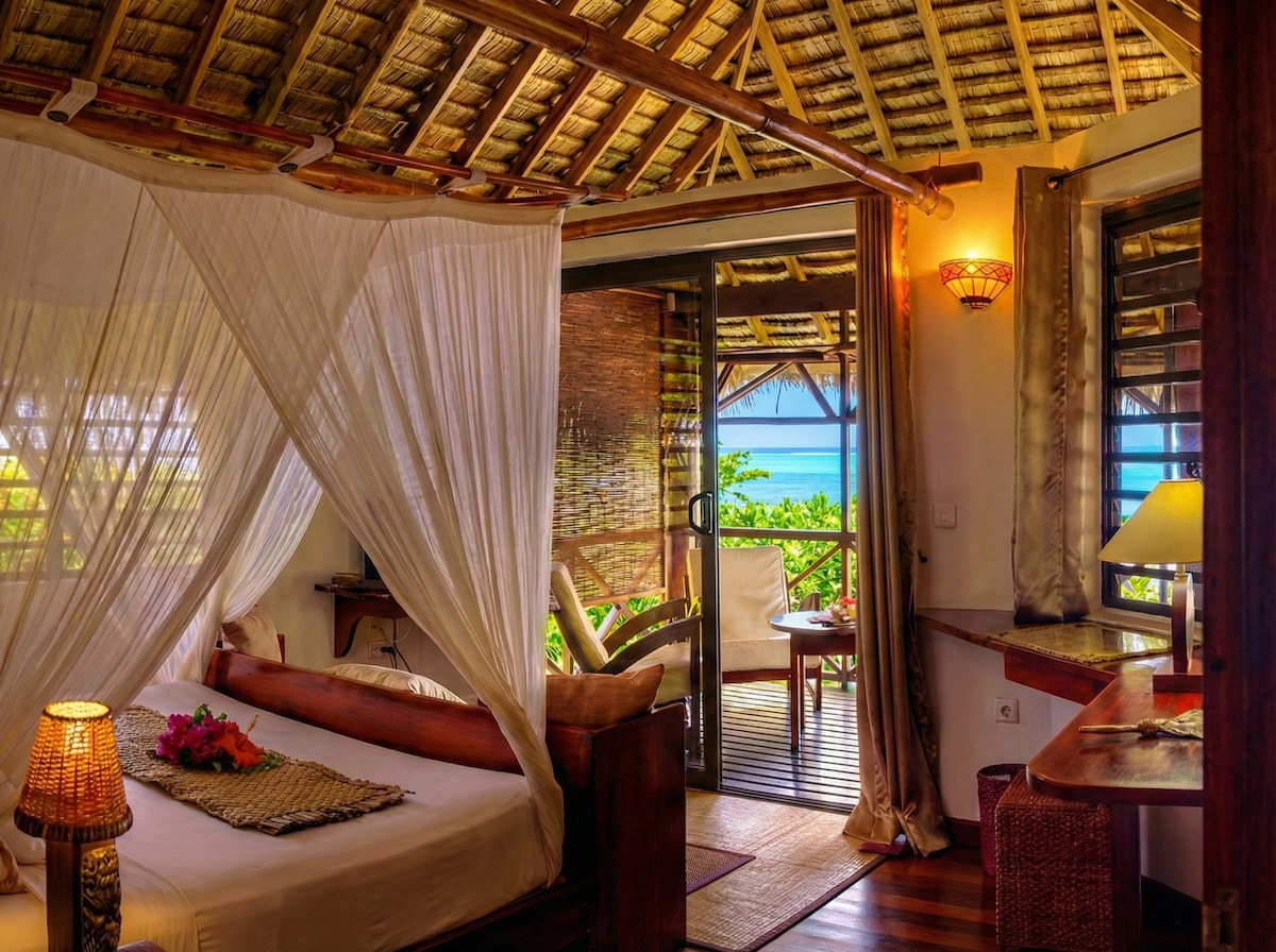 A 376 ft.sq. waterfront bungalow, ideally located , which can accomodate a maximum of 4 persons . Its interior is elegant and warmly decorated.Tucked into an enclosed garden with direct access to a private beach,you will wake up every morning with a view over the lagoon and will be able to easily enjoy it thanks to the small private beach and the amenities at your disposal (snorkeling gears, kayaks, paddles). Every evening, the sunset on Bora Bora offers a different and beautiful spectacle.