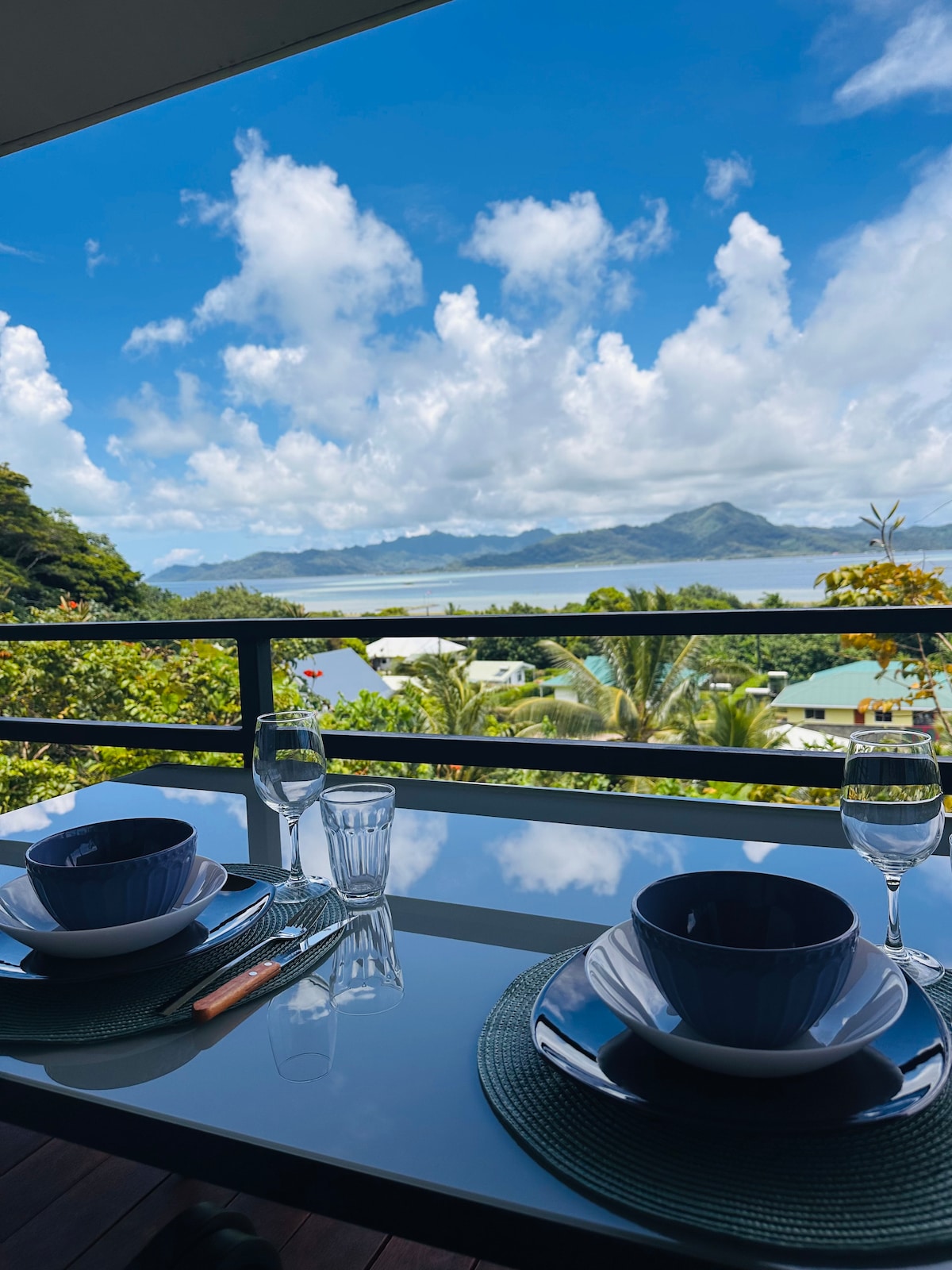 chambre avec grande salle de bain privative . deck et piscine ovoide 8M X4 devant la chambre . Vue imprenable sur Tahaa et le lagon . situé à un peu plus d'1km de la ville dans lotissement résidentiel, en hauteur à 70m d'altitude . dans la mesure de mes possibilités (90%) je viens vous chercher a l'aeroport gratuitement et je vous raccompagne a la fin de votre séjour ! un petit déjeuner tres copieux vous sera servi en terrasse , a l'heure qu'il conviendra . Pas de frais de nettoyage .