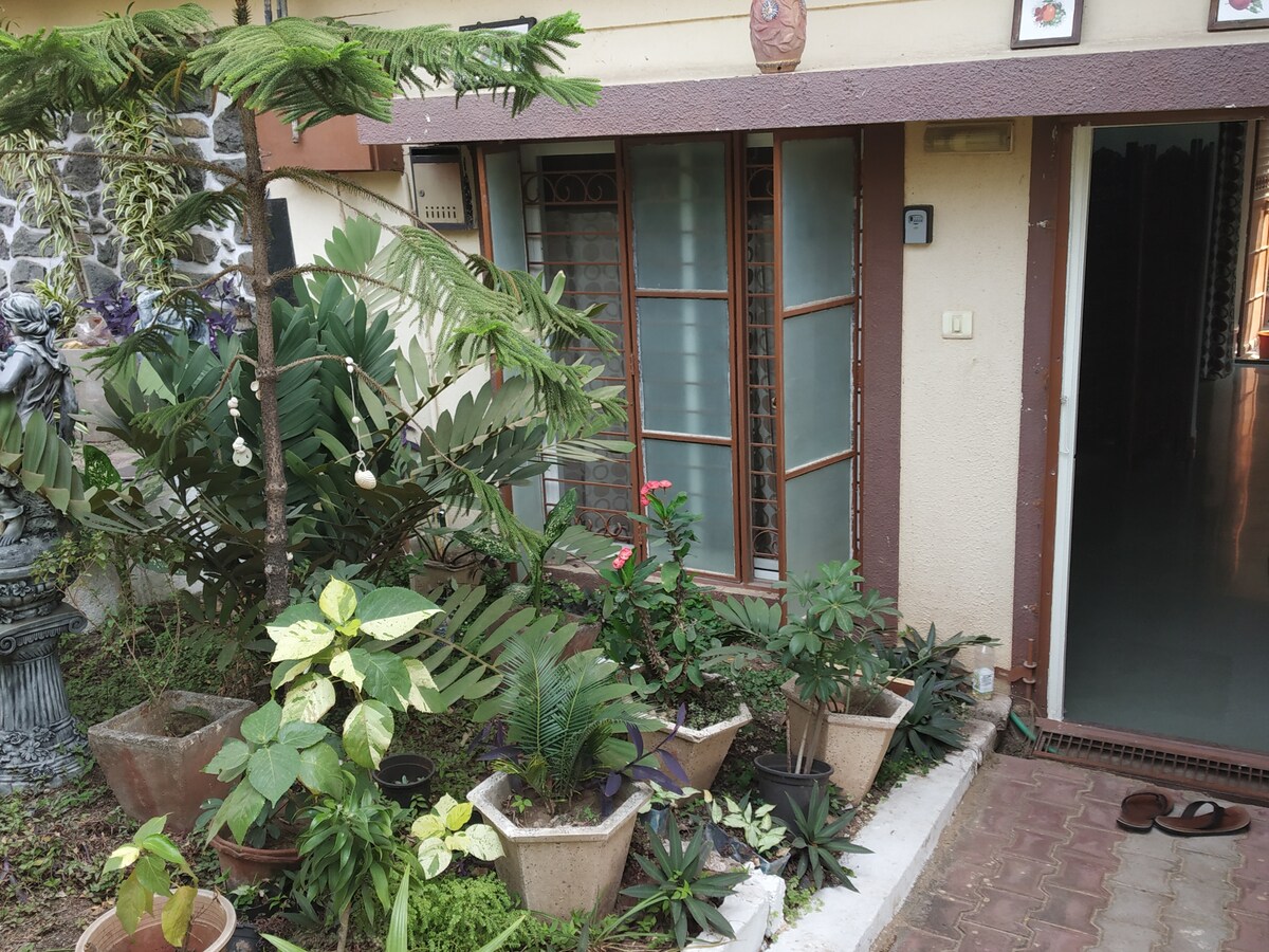 A cozy 1000 sqr ft. 1BHK The place is very quiet and calm. The house has following features : - Full kitchen with Gas stove, induction, microwave, refrigerator and utensils - Washing machine. Outdoor hanger to dry clothes. - Private garden - 32' TV, Fire TV with premium accounts for Netflix,Prime Video, SonyLiv, Zee5 - 24 Hour solar hot water - Inverter A/C - Wifi 100 mbps Tata fiber internet Enjoy the walk around the garden and the society.