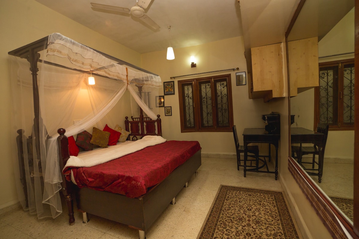 Our place is in a very quiet location.Ten minutes from airport close to malls Osho ashram shopping and sight seeing and good restaurants and pubs . ..it's a part of our house made specially made for guests .For security entrance has CCTV camera.The guests will have their set of keys to come and go whenever they wish since we stay in same building anything guests needs we easily give .property has no stairs it's on groundfloor.. it's sitting room bedroom washroom and kitchen on ground floor.