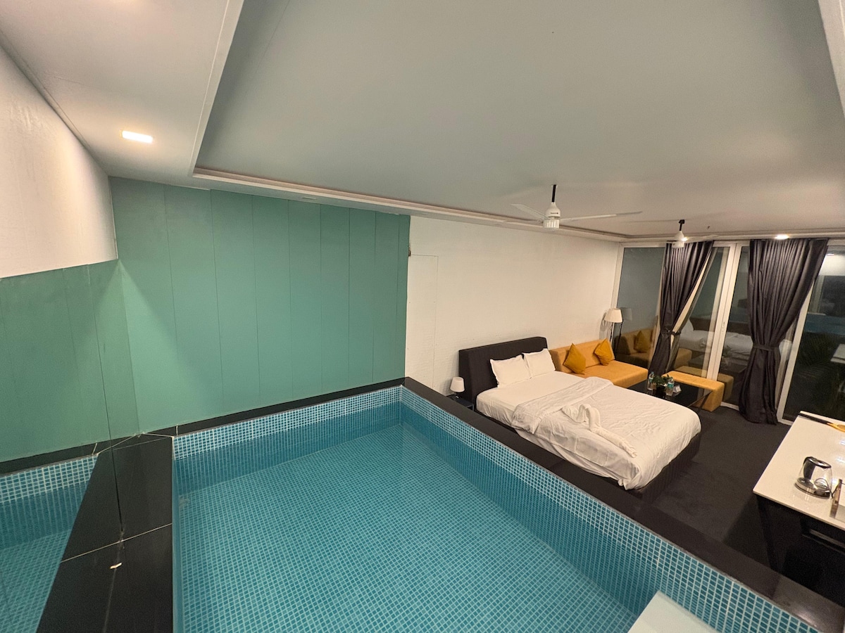 带按摩浴缸的私人冷水泳池,带空调的小屋