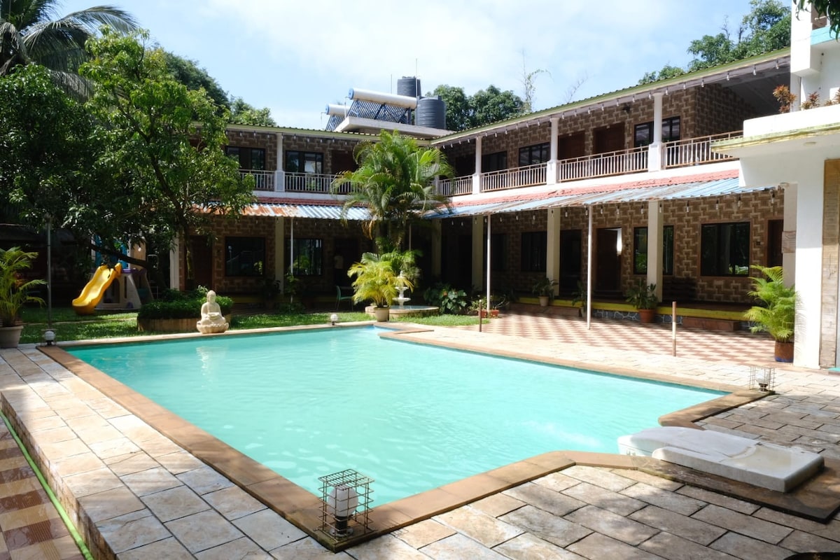 Pet friendly staycations, signature food experiences, and unparalled well-being awaits Kick back and relax in this calm, stylish space. Ensuite Cottage style large rooms in an established Coconut Plantation in Alibaug, which makes for an idyllic setting for a blissful holiday. This private property has EIGHT separate cottage style LARGE ROOMS with a poolside lounge & a separate living room space for dining. Each room is exclusive for guests, only the POOL & living room is shared.