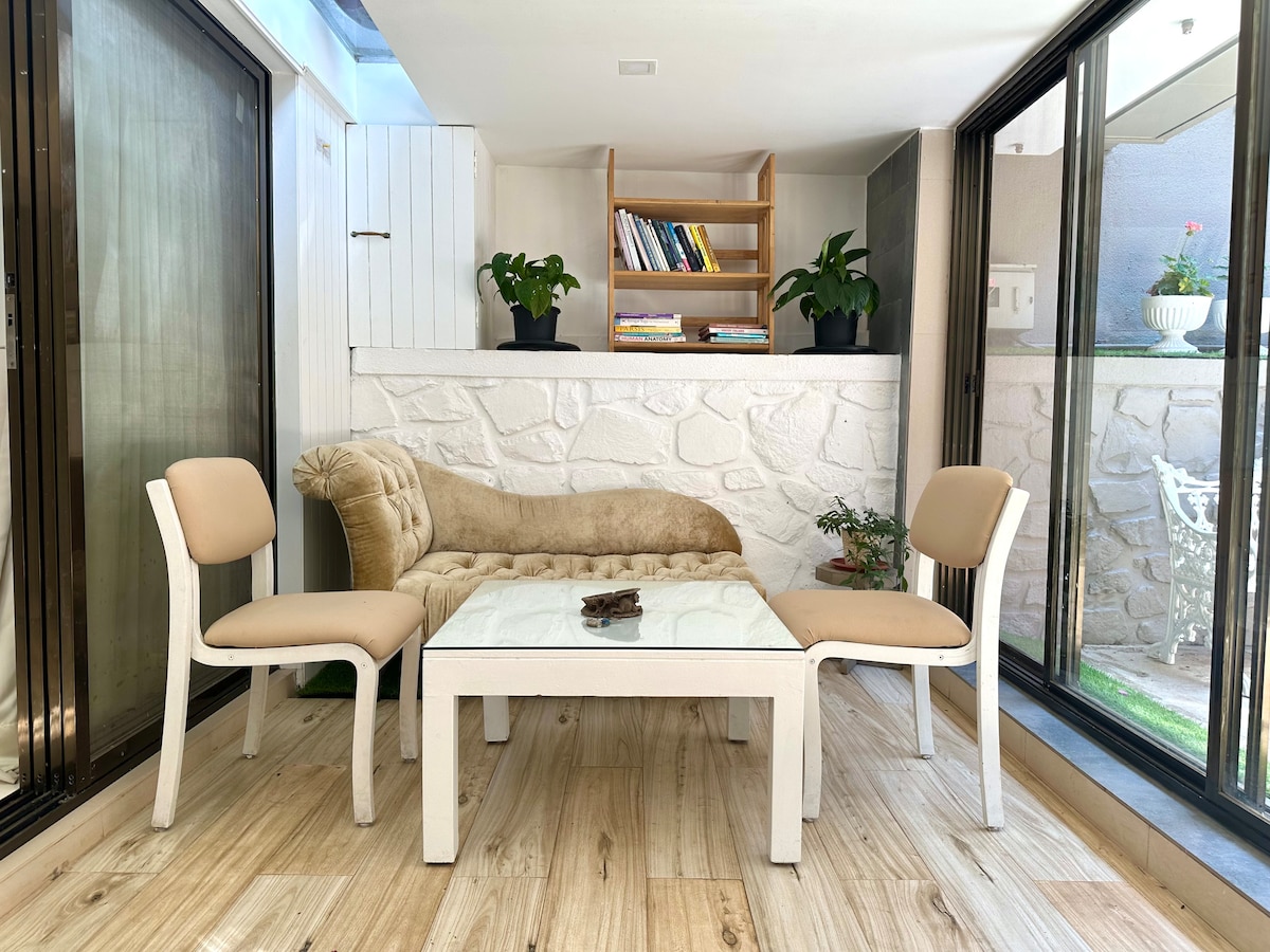 Kick back and relax in this calm, stylish space. The Studio is very spacious with a lot of plants and greenery around. The space is very unique and stylish and has a fully operational kitchen for people who like to cook. It comes with a small workstation and a beautiful patio where you can have peaceful evenings!! We also provide a common terrace with basic gym facilties and a space to stretch your body or do yoga or just chill and relax.