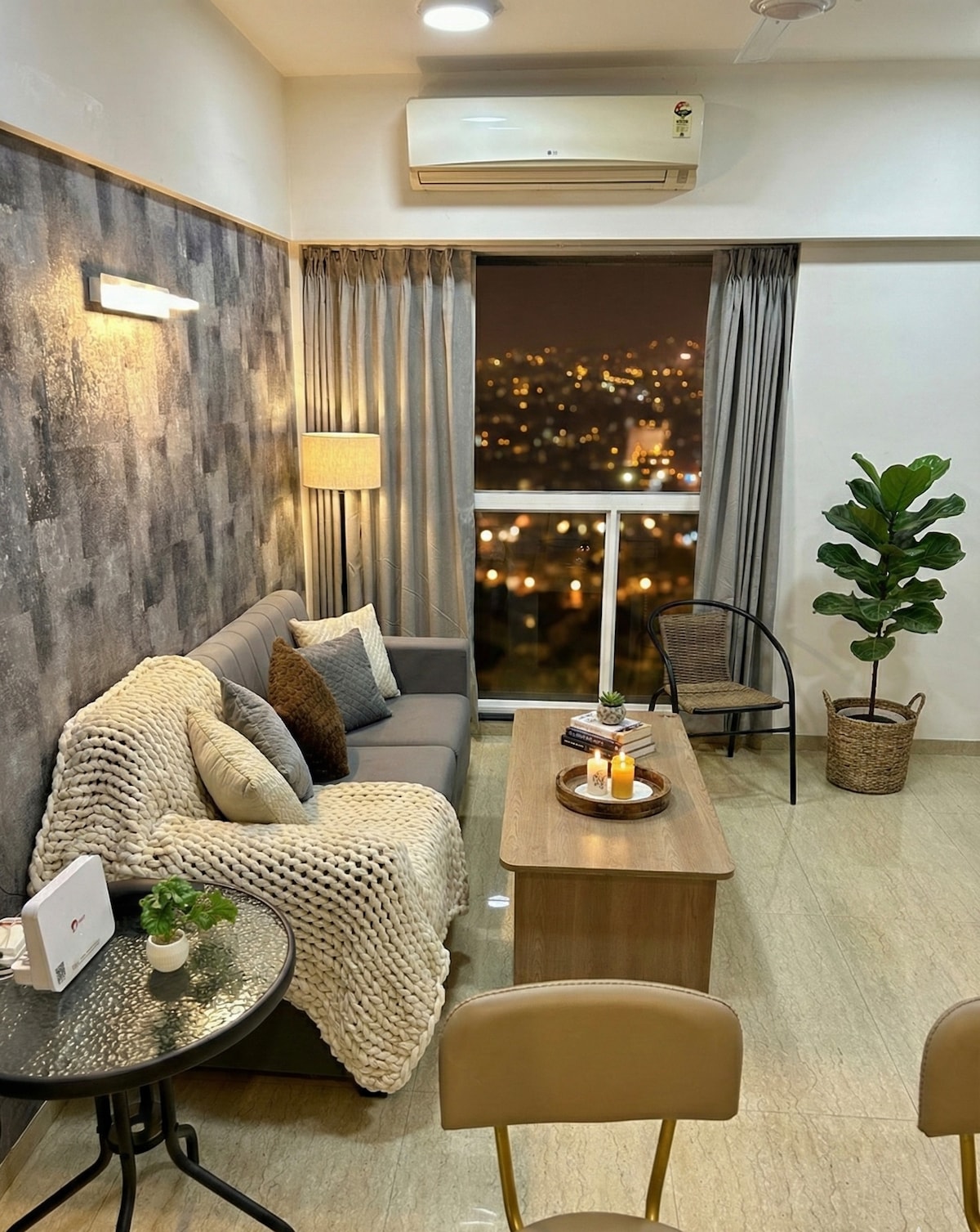 Escape to Zen Horizon, a stylish 1BHK sky suite perched on Pune’s 23rd floor. Wake up to panoramic skyline views, sip coffee on the balcony, and relax in a bright living room with smart TV. The cozy bedroom with premium bedding ensures restful nights, while the modern bathroom keeps you refreshed. A fully equipped kitchenette with microwave, fridge, and washer makes long stays easy. Perfect for family visits, or weekend getaways, this gated top-floor home blends comfort, convenience, and calm.