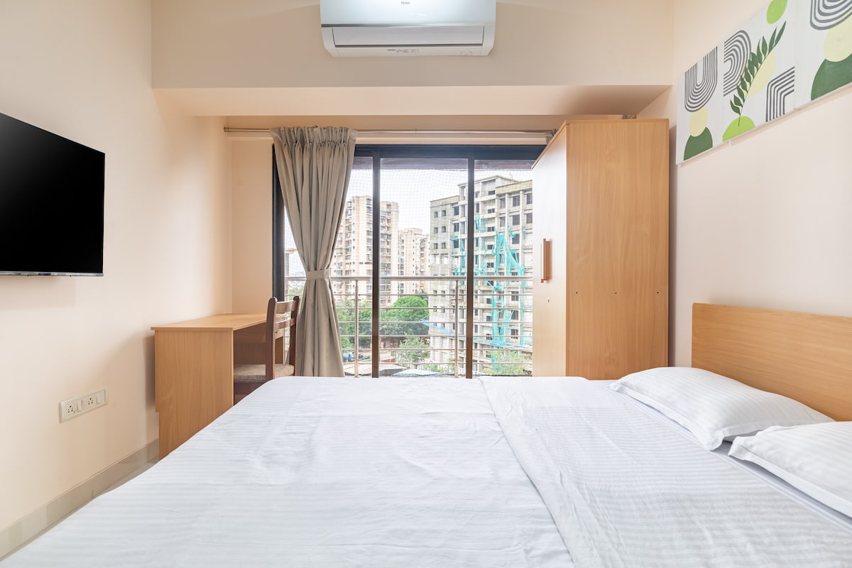 Welcome to our modern, well-maintained studio apartment in Ulwe, conveniently located near Navi Mumbai International Airport. Ideal for transit travelers, business professionals, and couples, this thoughtfully designed space offers a comfortable bed, air-conditioning, high-speed Wi-Fi, smart TV, and a functional kitchenette. 10 mins to Apollo hospital 5 mins to Atal Setu 5 mins to Navi Mumbai Airport 15 mins to seawoods mall