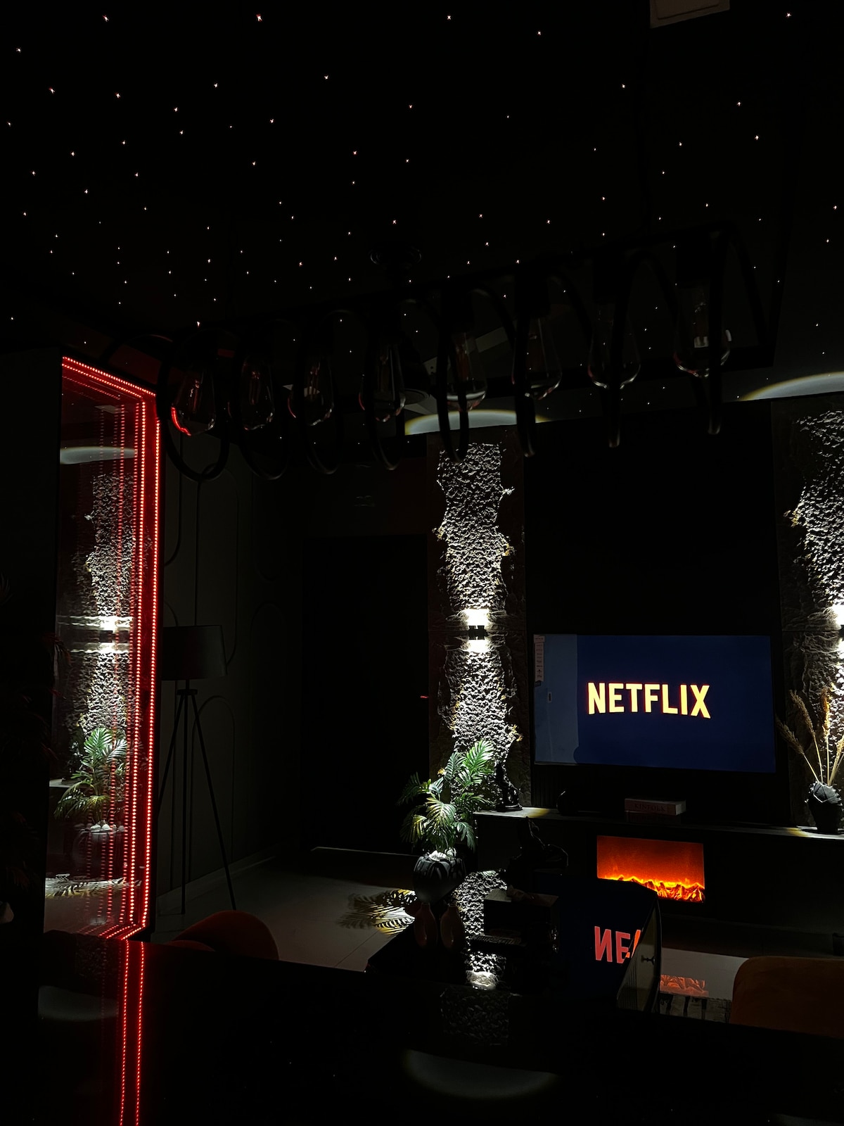 Luxury 1 BHK Ultra Premium Stary Lights Themed Apartment with 200 inch Projector screen for couples, friends, solo females and families as well located at Gulberg Lahore Peaceful and private area in the heart of Lahore Safe private & Secure Location - Self Check In with Pin Code - No need to meet anyone for keys - 24/7 Security - King Sized Bed With Soft Spring Mattress - 2 Ac - Kitchen with Electric Stove - Prime Location -Pool, Cinema, Gym -Basement Parking -Complimentary Snacks and Tea